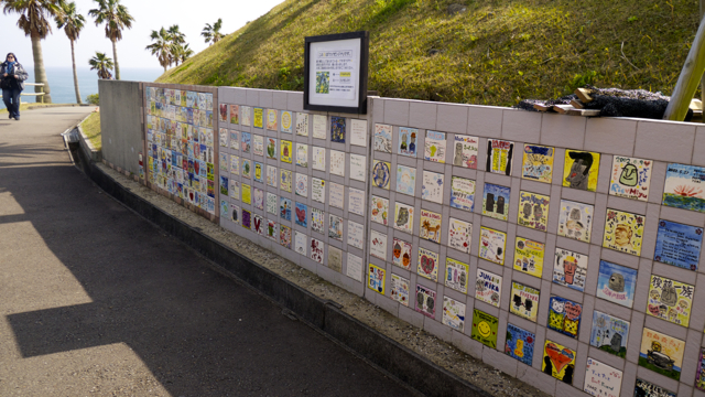 주차를 하고 약간 내려와서 사무소를 지나 있는 길을 따라 걸었습니다. 걸어가는 길에는 이 곳의 유명한 모아이 석상을 그려 놓은 아이들의 그림들이 전시되어 있더군요. 그나저나 왜 이 곳에 모아이 석상일까..... 왜 이스터 섬에 있어야 할 그 놈이... 설마 선사시대 그 이전에는 이스터섬과 일본이 하나의 섬이요, 문명이었던가.... 라고 생각할 수도 있지만.... 실제는 모아이 석상이 자연재해로 큰 피해를 입었을 때 이를 재건하는데, 일본의 한 업체가 큰 도움을 좋고, 이에 감사하는 뜻으로 모아이 석상을 이곳에 보냈다고 하더군요.