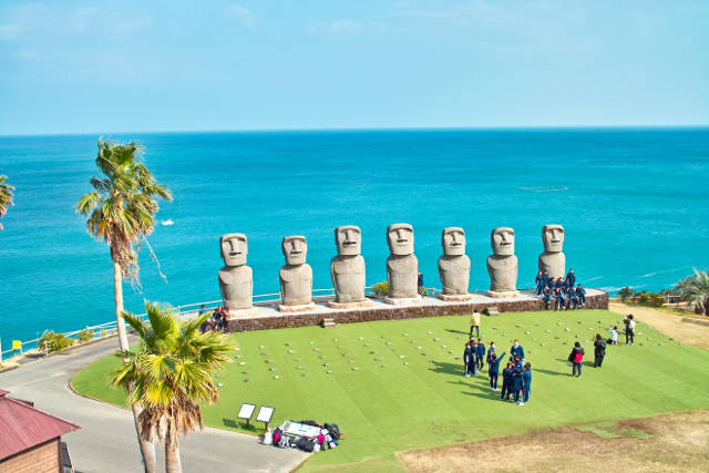 주차를 하고 약간 내려와서 사무소를 지나 있는 길을 따라 걸었습니다. 걸어가는 길에는 이 곳의 유명한 모아이 석상을 그려 놓은 아이들의 그림들이 전시되어 있더군요. 그나저나 왜 이 곳에 모아이 석상일까..... 왜 이스터 섬에 있어야 할 그 놈이... 설마 선사시대 그 이전에는 이스터섬과 일본이 하나의 섬이요, 문명이었던가.... 라고 생각할 수도 있지만.... 실제는 모아이 석상이 자연재해로 큰 피해를 입었을 때 이를 재건하는데, 일본의 한 업체가 큰 도움을 좋고, 이에 감사하는 뜻으로 모아이 석상을 이곳에 보냈다고 하더군요.