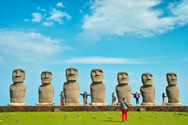 7개의 모아이 석상이 바다를 등지고 언덕 정상을 바라보며 서 있는데, 관광객들이 끊임없이 들어와서 석상을 안거나 그 사이 또는 앞에 서서 사진을 찍더군요. 이 7개의 모아이 석상은 입장권 뒷면에 보면 각각이 다른 운을 뜻한다고... 이스터 섬에서부터 그랬을까 의심도 되지만, 뭔가 부적처럼 믿고 싶어하는 일본인들의 의미부여가 아닐까 싶지만.... 어쨌든 사람들은 석상에서 떨어지려 하지 않더군요.