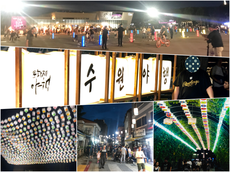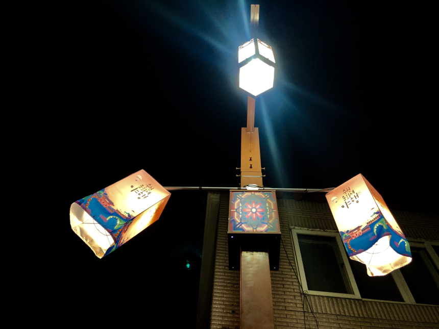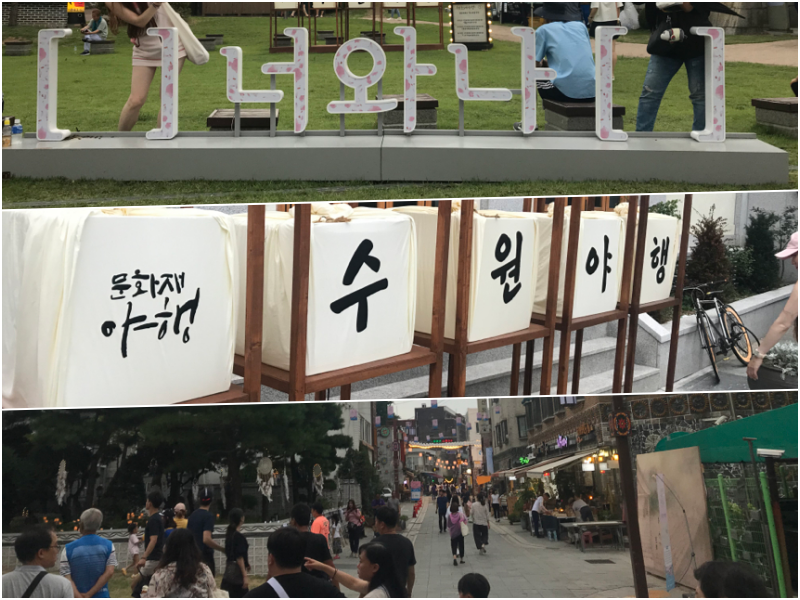 행궁의 경우에는 야간개장을 미리 신청했어야 (아 축제기간만입니다.) 되어서 행궁 안으로는 못 들어가 봤지만, 행궁광장과 공방거리, 그리고 화서문으로 향하는 행리단길의 야경은 매우 이뻤네요. 종종 축제 기간이 아니더라도 이 길을 저녁 때 마나느님과 놀러 나와야겠다는 생각이 들더군요.