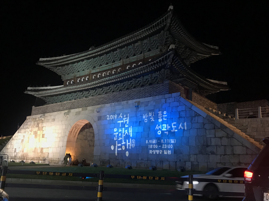 수원월드컵경기장에서의 충격적(?)인 패배를 보고 나서는 집으로 바로 향하지 않고, 화성행궁으로 Drive를 갔었드랬습니다. 그랬는데, 늘 지나가던 길에 있던 장안문에 신기한 게 보이더군요. 바로 아래 사진과 같이 "2019 수원문화제 야행"이라는 글자가 똬앆~!