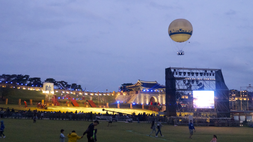 4일째 일요일, 마지막 날이었습니다. 같은 날에 월드컵 경기장에서 볼 경기가 있어서 일단 거기 2시 경기를 보고 집으로 돌아오는데, 창룡문사거리에서 화성행궁방향으로 교통 통제를 하더군요. 문화제의 공식폐막행사가 창룡문 안마당에서 하는 건 알고 있었지만, 이렇게 대대적으로 하나 싶었고, 또 7시에 공식 행사가 시작인데 4시반부터 사람들이 나와서 연도 날리고 하면서 기다리고 있는 게 신기해서, 집에 들어가자마자 대충 씻고 끼니를 때운 뒤에 바로 집에서 나와 터벅터벅 언덕을 올라 창룡문과 연무대 사이 안 뜰로 향했습니다.