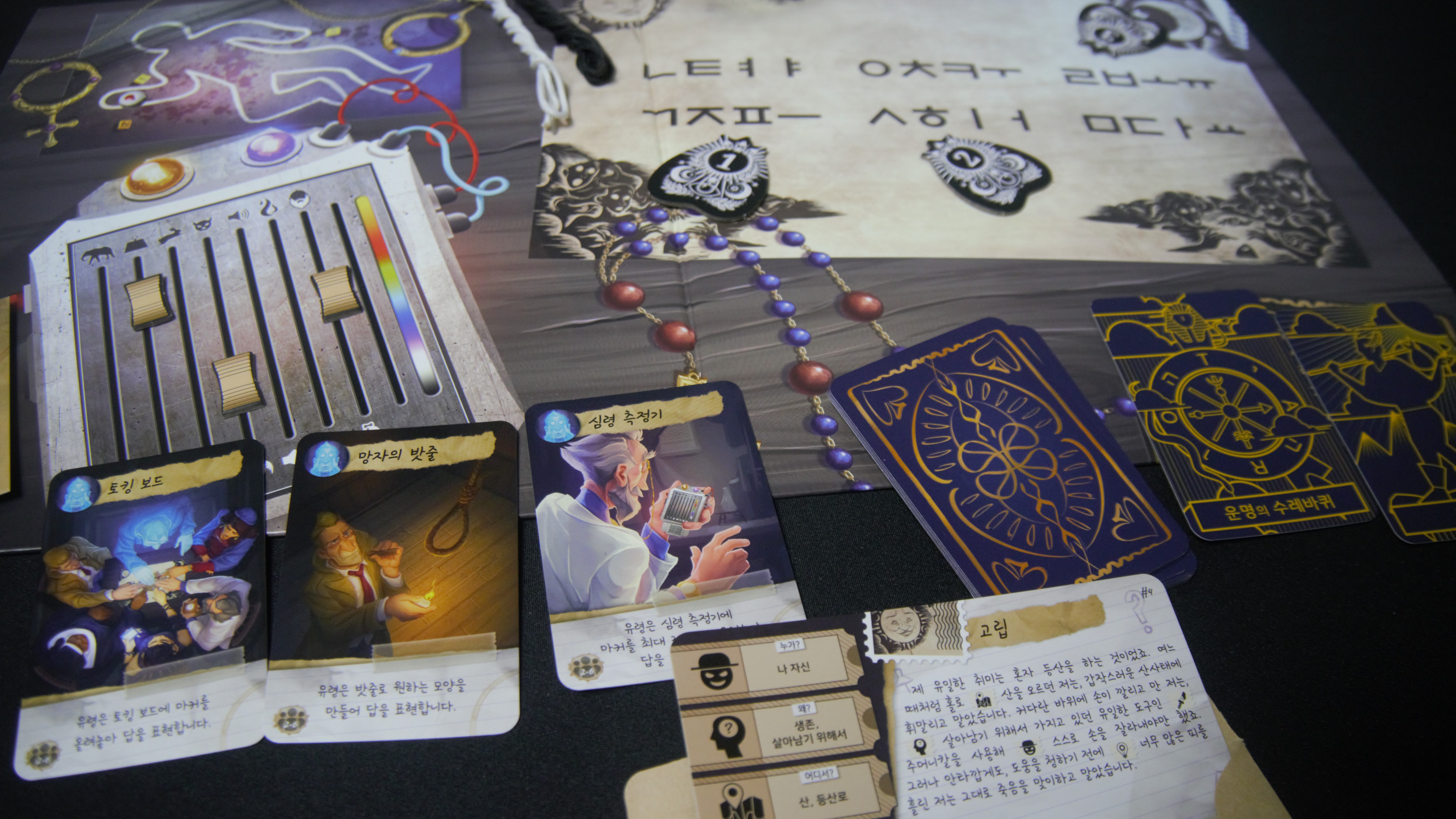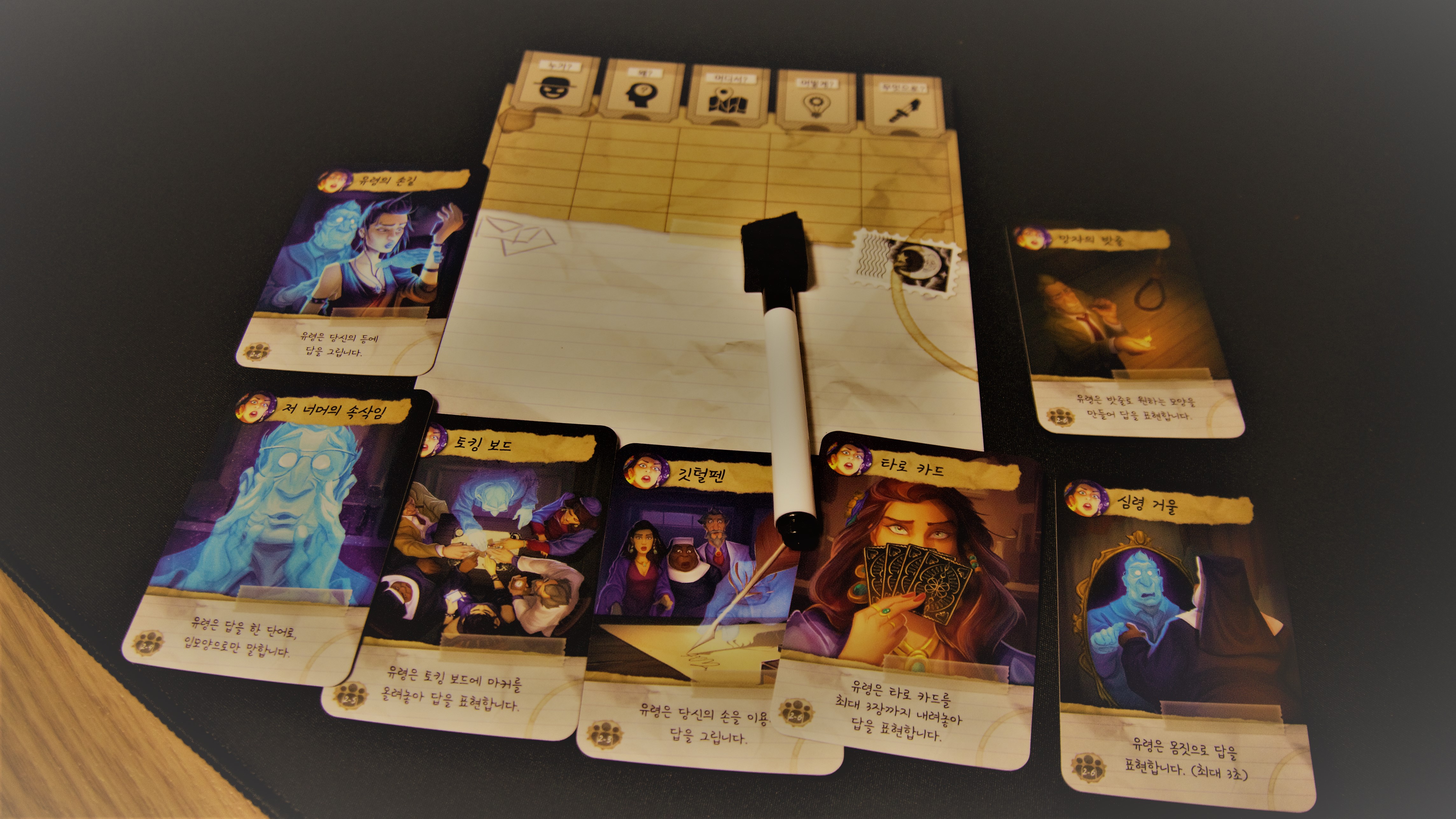 근데, 여기서 플레이어 중 한 명은 이 희생자, 바로 유령이 되어서 다른 플레이어들에게 사건 해결에 힌트를 주는 역할을 해야 합니다. 하지만 유령(!)이다 보니, 직접적으로 대화를 통해서 힌트를 전달하지 못합니다.