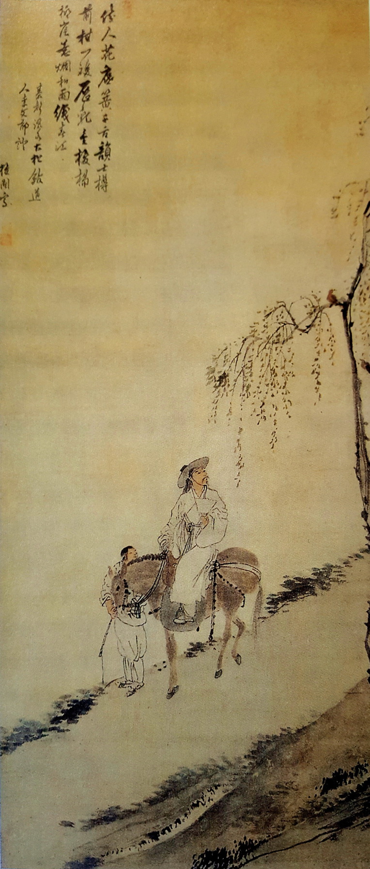 같은 전시실에는 김득신은 물론 김홍도의 그림도 전시되어 있었습니다. "고사인물도" 중 세 작품이 전시되어 있었고, 그리고, 이 날 "훈민정음"과 "강산무진도"와 함께 저를 가장 매료시켰던 작품이었던, 김홍도의 "마상청앵도" 말을 타고 가는 선비와 말을 이끌고 있는 동자가 가던 길을 멈추고 고개를 돌려 비스듬이 위로 바라 본 곳에 있는 버드나무 속 꾀꼬리. 가는 길이 바쁘겠건만, 들려오는 소리에 발길을 멈추고 마치 덕통사고에 빠진 양 넋이 빠져 쳐다 보고 있는 모습에 나도 선비와 동자의 눈길을 따라 자연스레 앵무새를 바라보게 되는......