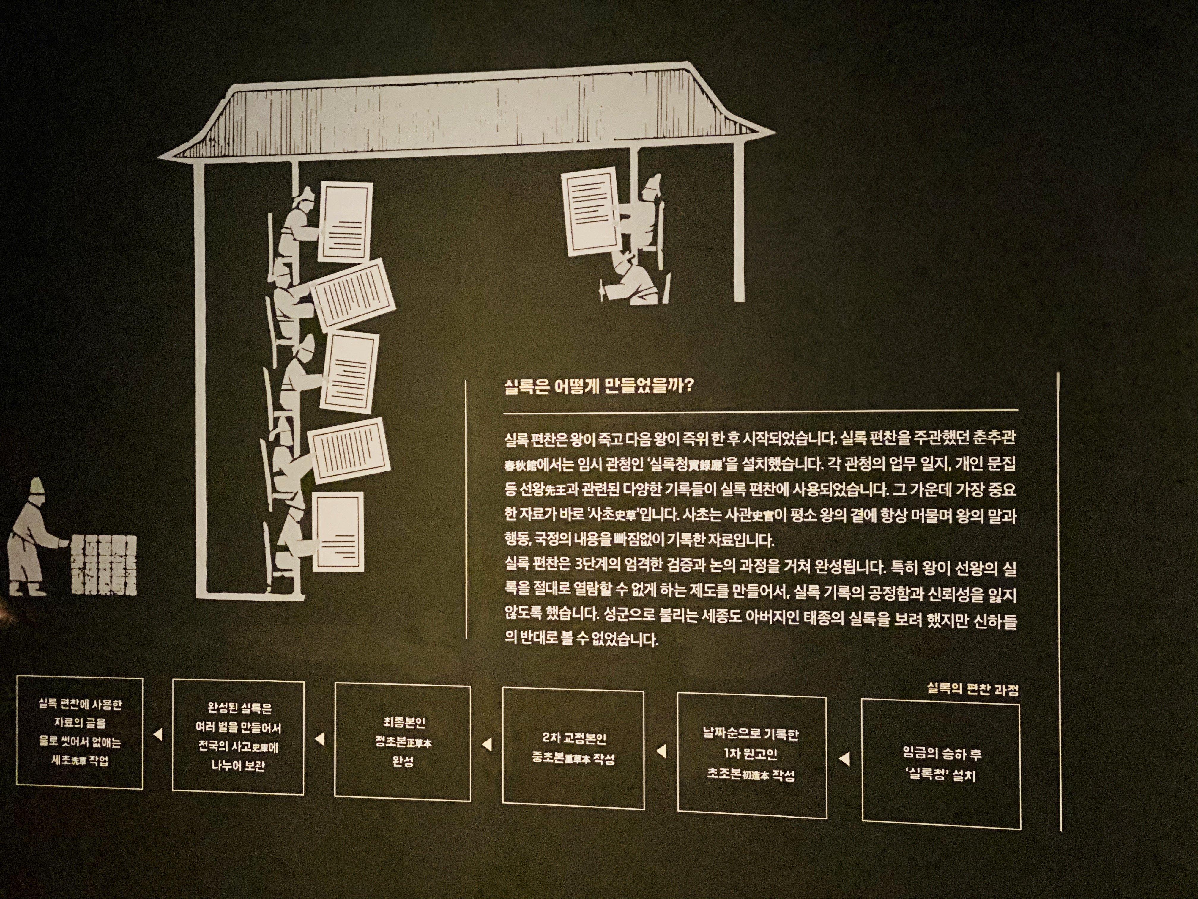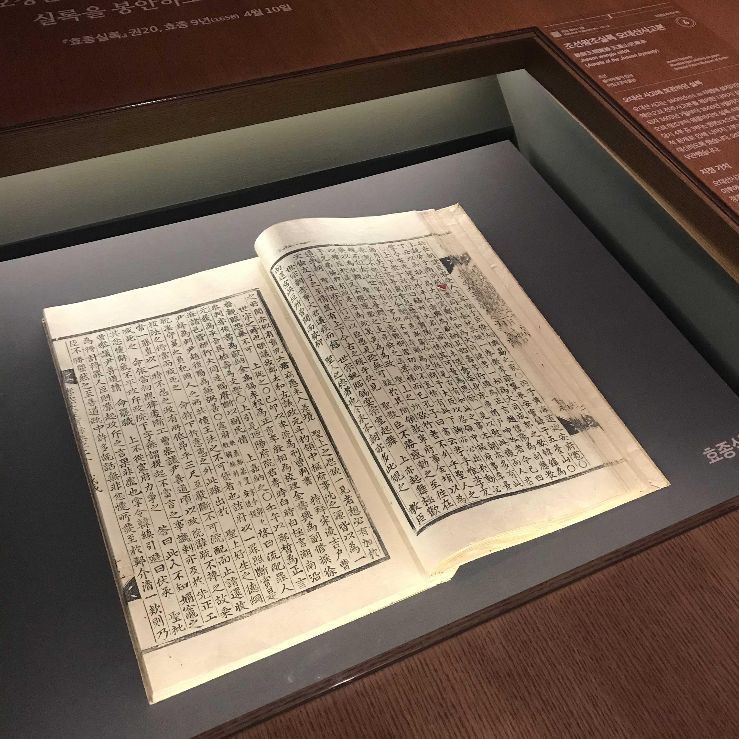 첫 전시실에는 대한민국 역사 기록의 끝판왕인 ‘조선왕조실록’이 거의 대부분의 내용을 차지하고 있습니다. 기존에 보유하고 있던 버전(정족산 사고 본...으로 기억) 말고 오대산사고본(국보 151-3호) 중심으로 추가로 발견된 것들이나, 같은 주제/소재이나 집권세력에 의해 재편집되었던 내용과 관련된 것. 그리고 절대 지우개를 쓰지 않고 종이를 덧대어서 기술한 것 등등 조선왕조실록과 관련되어 관심있을만한 내용을 실록 서책들을 펼쳐 전시하고 있더군요. 글씨들도 참 정갈하고 이쁘더군요.