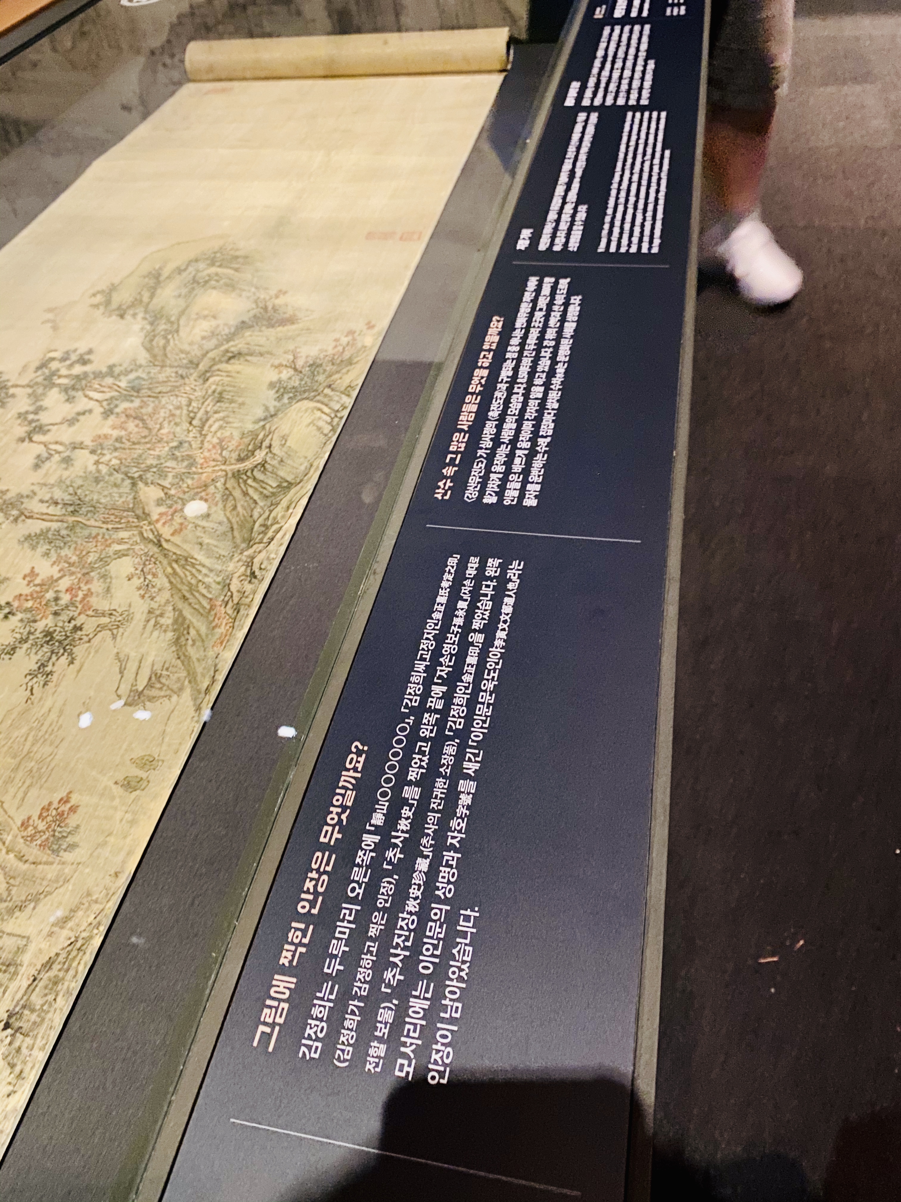 어쨌든 다음 전시실에는 ‘이인문’의 강산무진도와 심사정의 ‘촉잔도권’의 이른바 두루마리에 엄청난 가로 길이를 자랑하며 그려둔 그림이 전시되어 있더군요. 촉잔도권은 우리나라가 아니라 촉나라, 즉 유비의 그 촉나라로 장안에서 들어가는 길, 한고조 유방이 서초패왕 항우에게 밀려 한중 땅으로 밀려날 때 지나갔다던 그 잔도를 얘기를 듣고 그린 작품인데... 솔직히 개인적으로는 그 맞은 편에 있고, 또 이 전시실의 벽에 일부가 옮겨 그려져 있는, '이인문'의 강산무진도가 정말 말도 못할 정도로 멋있고 또 좋았드랬습니다. 강과 산이 "무진", 말그대로 끝없이 이어지는 그림이었는데, 산봉우리와 계곡, 절벽들, 논밭, 강가 등이 이어지지 않고 그려져 있으면서, 또 그 안에 무려 360여명의 사람들이 각기 다른 모습으로 그려진.... 그림의 크기는 정말 두루마리가 영원할 거 같이 죽 이어지는데, 그 위에 강산도 지루하지 않게 변화를 줘 가면서 그려져 있고, 그 안의 나무나 사람, 화초 등을 그려낸 세세함이란.... 정말 Two Thumbs Up. 추사 김정희가 자자손손 남겨야할 보배라고 하며 인을 찍어 남겼는지 그 맘을 알겠더군요.