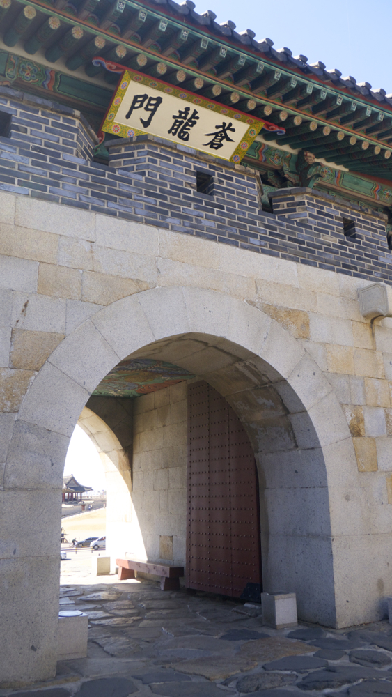 위 사진에서 오른쪽으로 돌아가 보면, 아래 왼쪽과 같은 틈으로 진입이 가능하고, 그렇게 되면 아래 오른쪽과 같이 문의 현판이 보입니다. 방위 상 동쪽이다 보니 청룡, 즉 용이 문 이름에 들어와 있고, 또 아래서 보시다시피 파란색 깃발입니다. 창룡문의 '창'도 사실은 파란 하늘의 창천에 쓰이는 그 푸르름을 뜻하는 한자입니다.