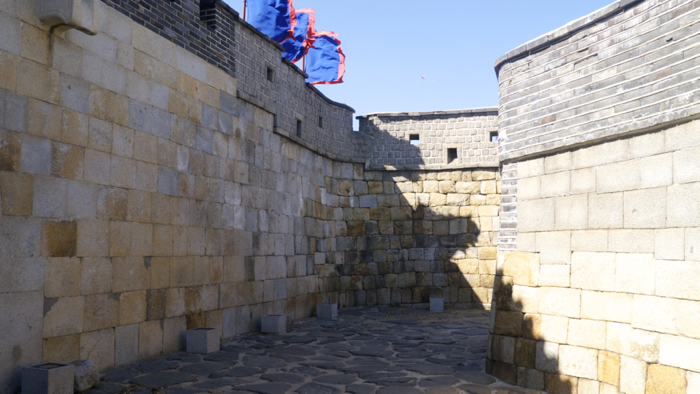 위 사진에서 보면 문 전각에서 보이는 옹성의 모습입니다. 사람이 2명 정도 걸어 갈 수 있는 폭이 있어서 옹성 앞뒤로 방어하기에 딱 좋은 구조인 게 명확히 보이네요.
