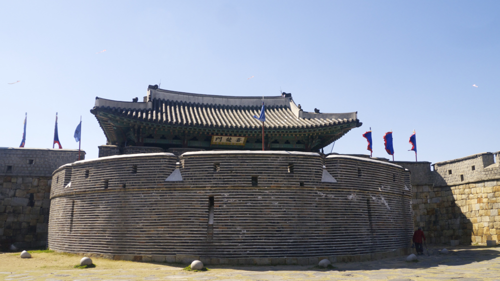 주인장의 거주지가 근처다 보니 늘 성곽 산책은 수원화성의 동문에 해당하는 창룡문에서 시작합니다. 창룡문은 아래 사진에서 보듯이, 1층 짜리 전각과 옹성(성곽 방어용으로 성 밖에 또 지어놓은 성곽)이 있는 구조입니다. 정면에서 보면 일단 문이 보이지 않죠.