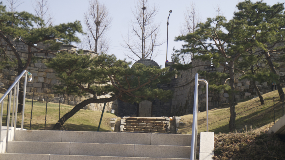 동장대에서 성곽을 따라 걸어 내려오다 보면 일반도로와 다시 접점이 생기면서, 갑자기 아래로 훅 내려가는 조그만 문이 하나 등장합니다. 화성의 4대문은 밤이 되면 문을 걸어 잠그기 때문에, 심야에 급히 나가야 하거나, 전쟁 중에 물자를 몰래 들이기 위해 암문이라고 하는 조그만 문을 만들어 뒀는데, 화성의 암문 5개 중 하나인 동암문이 이번에 보실 내용입니다. 원래는 계단이 없었지만, 도로 등 이미 점거(?)하고 있는 시설들 때문에 원래보다 약간 높은 곳에 성벽이 만들어지면서 어쩔 수 없이 계단을 추가로 만들었다고 하더군요.