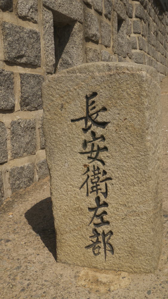 각건대를 지나서 이제 내리막을 내려가다 보면 아래와 같은 비석 하나가 있는데, 양 옆으로 다른 글이 적혀 있습니다. 해석하면 장안수비대 좌군과 장안수비대 우군이라는 뜻인데요, 바로 각 부대 별로 방어하는 영역을 구분하는 표식입니다. 성곽 길을 걷다 보면 이런 표식이 몇 개 더 발견하실 수 있습니다.