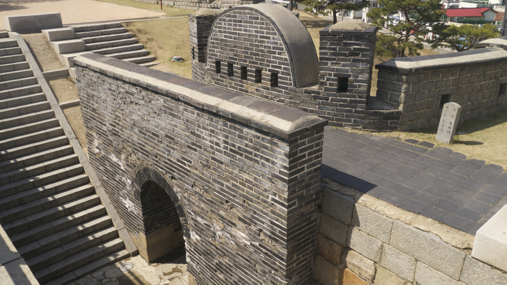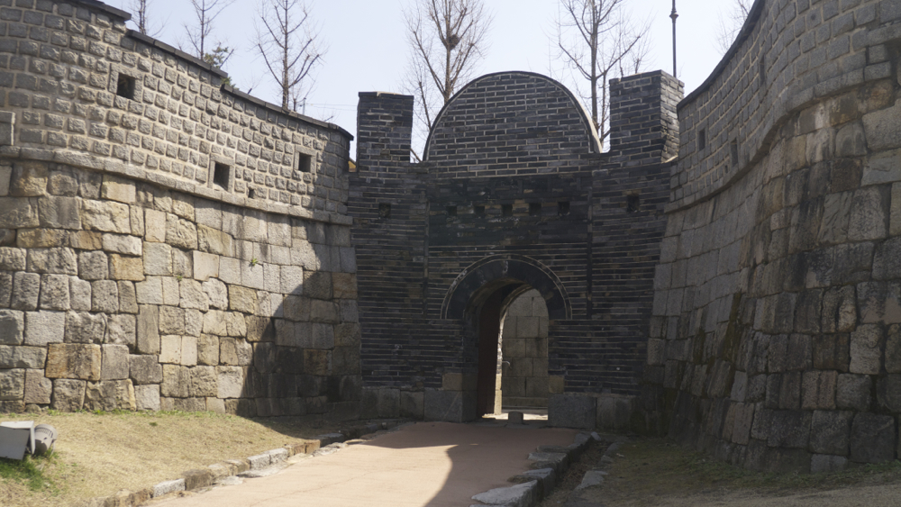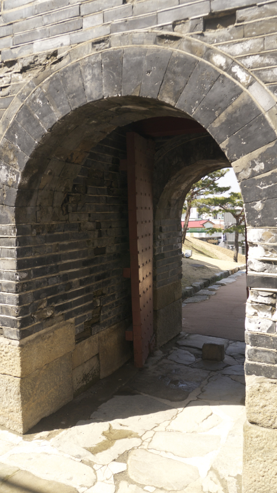 동장대에서 성곽을 따라 걸어 내려오다 보면 일반도로와 다시 접점이 생기면서, 갑자기 아래로 훅 내려가는 조그만 문이 하나 등장합니다. 화성의 4대문은 밤이 되면 문을 걸어 잠그기 때문에, 심야에 급히 나가야 하거나, 전쟁 중에 물자를 몰래 들이기 위해 암문이라고 하는 조그만 문을 만들어 뒀는데, 화성의 암문 5개 중 하나인 동암문이 이번에 보실 내용입니다. 원래는 계단이 없었지만, 도로 등 이미 점거(?)하고 있는 시설들 때문에 원래보다 약간 높은 곳에 성벽이 만들어지면서 어쩔 수 없이 계단을 추가로 만들었다고 하더군요.