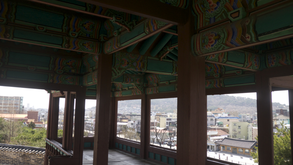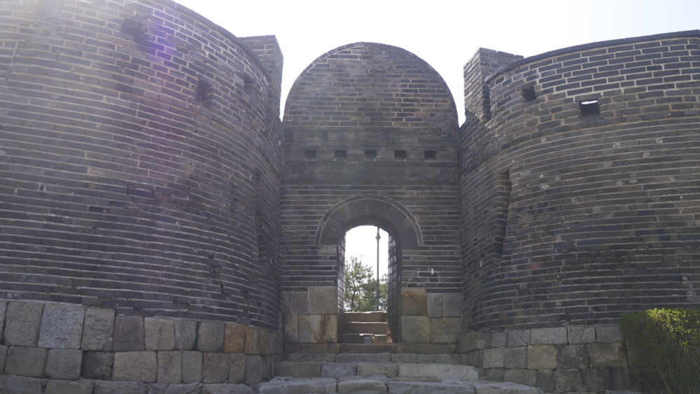 동북포루에서 터벅터벅 성곽을 따라 내리막길을 내려오면, 짧은 구름다리 같은 게 나옵니다. 위에서 내려오다 보니 북암문의 상단, 즉 파수병이 서 있는 자리를 보다 보니 구름다리 같아 보이는데 실제로 좀 더 내려와서 보면 동암문과는 비슷하면서도 다른 북암문이 나타납니다. 그리고 그 너머에는 다음 Spot인 동북각루/방화슈류정이 보이네요.