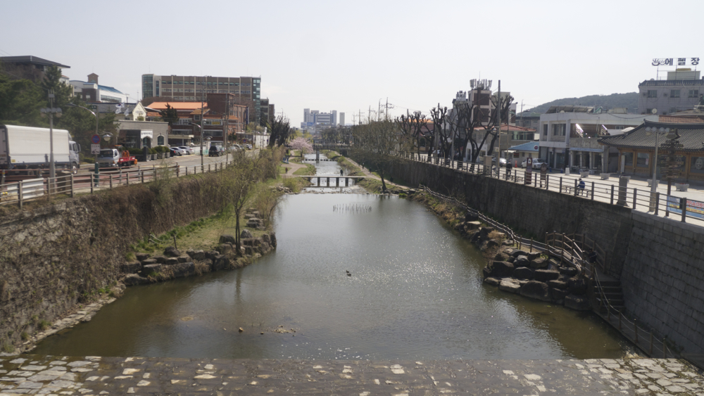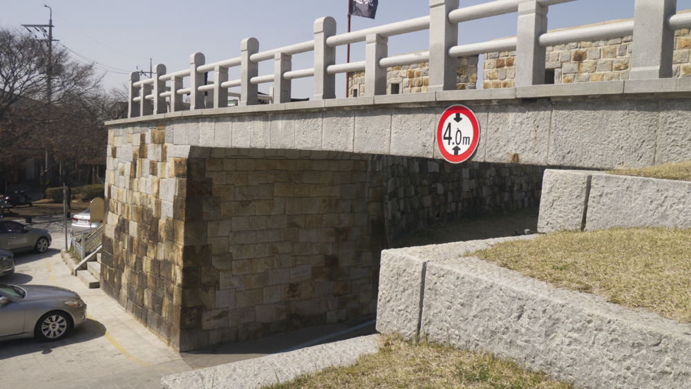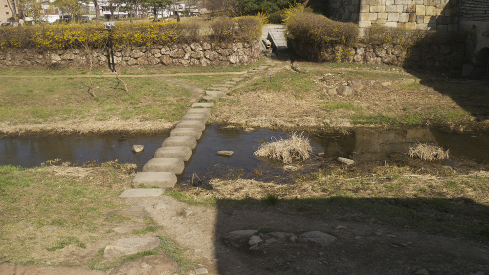성곽 아래에 물길이 지나가게 해주는 7개의 무지개 모양의 문(이를 홍예문-虹霓門이라 함)위에 누각을 지어서 군사적 목적을 함께 수행하도록 되어 있는데요... 성곽 밖으로는 아래와 같이 돌다리가 있어서 사람들이 수심이 높지 않을 때는 건너다니기도 합니다.