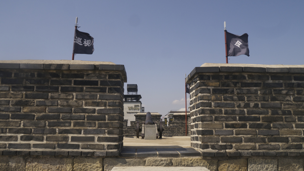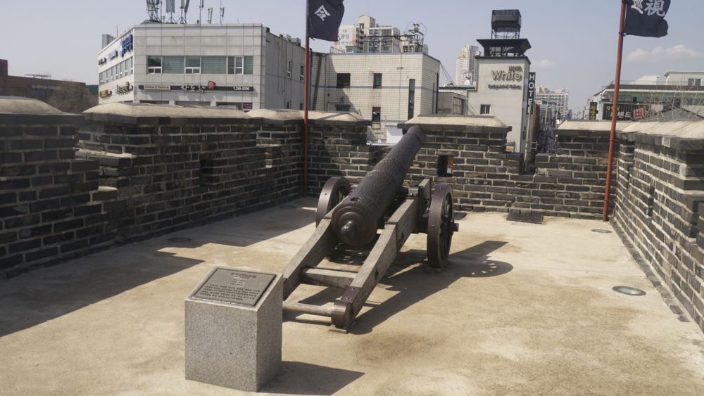 성곽 위에서 걸어가다 보면 북동적대는 아래 사진과 같이 뭔가 숨겨진 곳 같이 계단을 올라가야 되는 구조물입니다. 그 사이로 보면 대포가 놓여져 있는 게 보입니다. 이 대포와 함께 장안문을 수비하는 병사들이 지키는 역할을 하는 또 하나의 치성입니다.