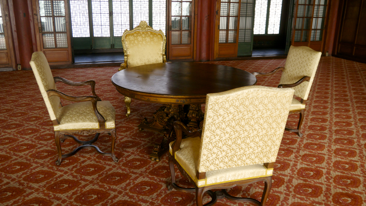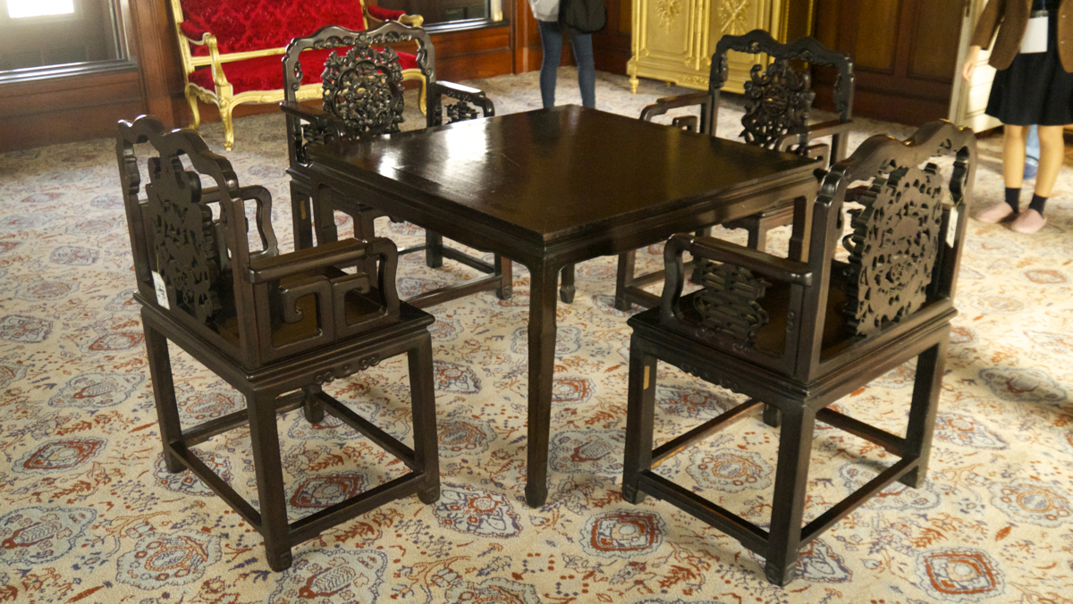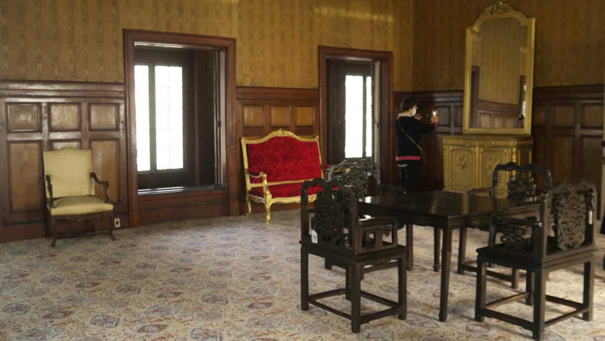 열심히 사진을 찍는 사이, 가이드 분이 옆의 또 다른 접견실로 또 안내를 해주셨는데 이 곳은 완전히 서양식으로 되어 있더군요. 다른 문양의 밝은 색의 카페트가 깔려 있고, 이 접견실의 반대쪽 벽은 조선식의 옆방과는 달리 완전 서양식 창/문틀과 커다란 거울대도 있더군요. 그리고, 아주 짙은 갈색의 사각 식탁과 4개의 의자. 샹들리에도 유리장식이 화려한 등이 달린 것으로 되어 있고, 방문 하나 왔다갔다 하는데 분위기가 영 다른 2개의 공간이 존재하더군요.