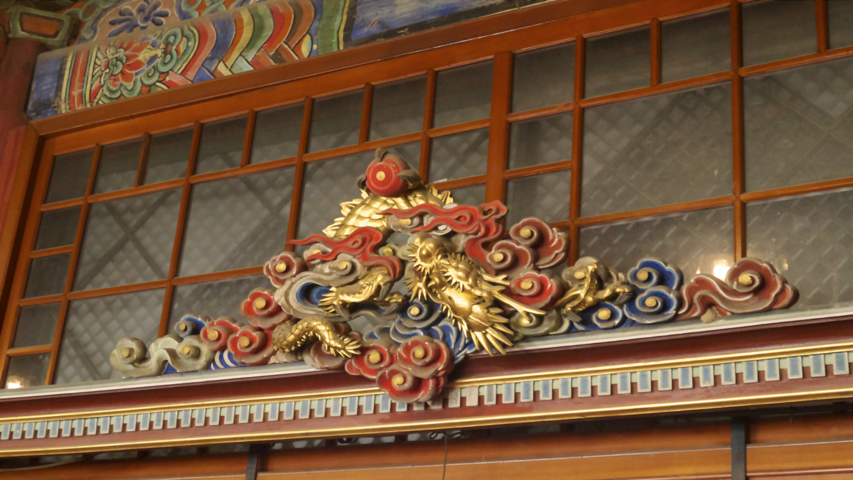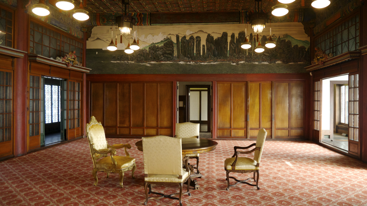 분명 바깥 문/문지방이나 기둥 그리고 천정의 문양이나 기둥에 새겨진 문양들은 분명히 이 공간이 조선의 궁궐임이 분명한데, 천정에는 샹들리에 전등인데 우리네 노리개 같은 다회띠가. 그리고는 해강 김규진의 금강산만물초승경도(金剛山萬物肖勝景圖)와 총석정절 경도(叢石亭絶景圖)가 양쪽 윗 벽에 전시되어 있고, 근데 그 가운데 바닥은 카페트가 깔려 있고, 서양 응접실에서나 볼 수 있던 원탁과 서양식 푹신푹신 의자가.... 카페트를 이렇게 깔아두면 희정당이 지상에서 1.5m 정도 높은 곳이라서 여름엔 습기, 겨울엔 결빙이 카페트 아래인 목조 건물에 생기게 되어 이 카페트 아래에 짚단으로 내열/방한 기능을 하도록 했다는 설명을 들었습니다.