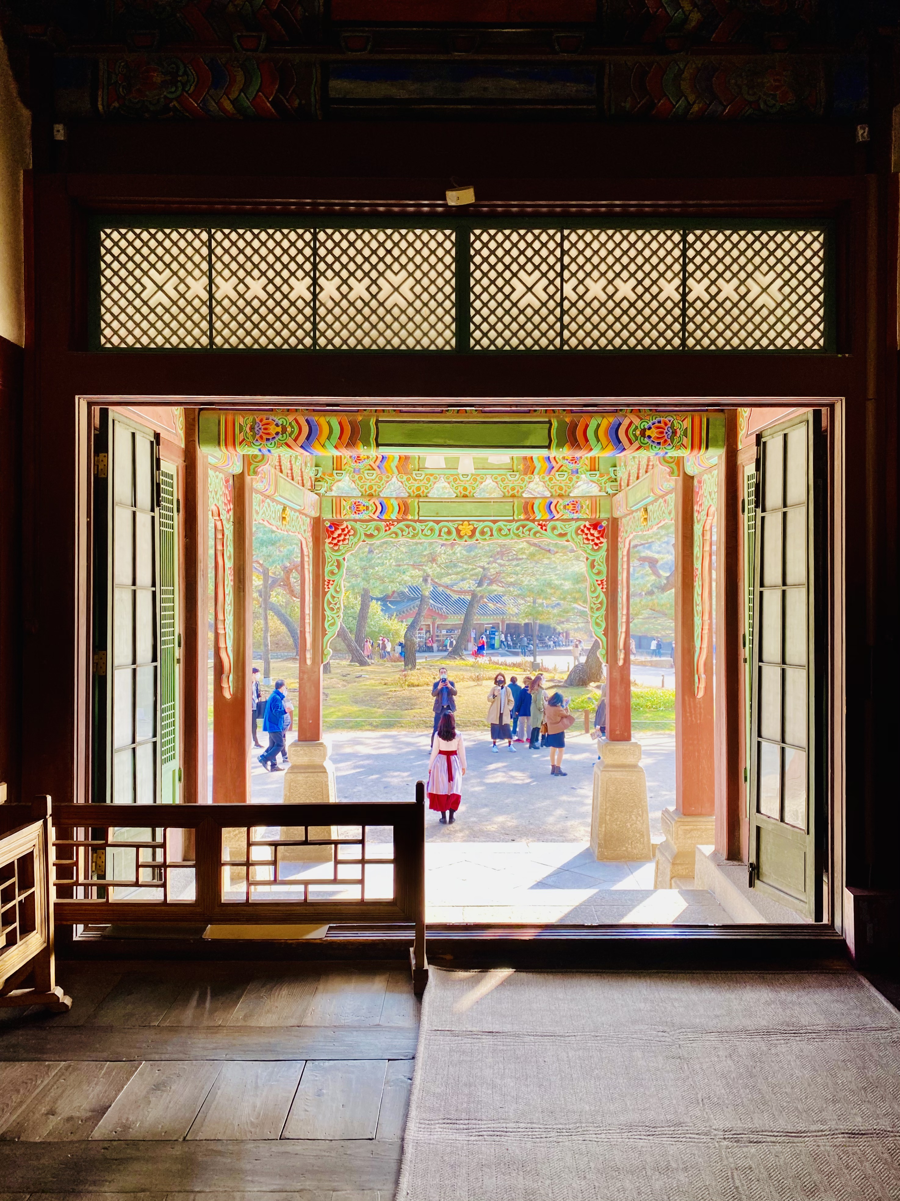 희정당에 도착해서는 가이드 분과 도와주시는 다른 두 분의 도움을 받아서는 신발을 실내화로 갈아신고는 드디어 희정당 내부 투어를 시작했다. (다른 분들이 따라 들어오려 하는데.... 죄송해요 이건 특별관람이라, 내년에 꼭 예매하고 들어오세요. 희정당은 'ㅁ'자 구조로 되어 있으며 'ㅁ'자로 둘러 싸여진 안쪽은 조그만 별도 정원... 아직 복원이 안 되었는지 풀밭이 존재하고 'ㅁ'자로 된 통로를 기준으로 정원 반대쪽, 쯕 바깥쪽 방향으로는 여러개의 방이 존재하는 그런 구조였다. 이 바깥 쪽에 존재하는 방들의 바깥 쪽 창이 내부에 들어오지 못하는 일반 관객들이 보게 되는 희정당의 창틀/창문과 전각의 모습이 된다.