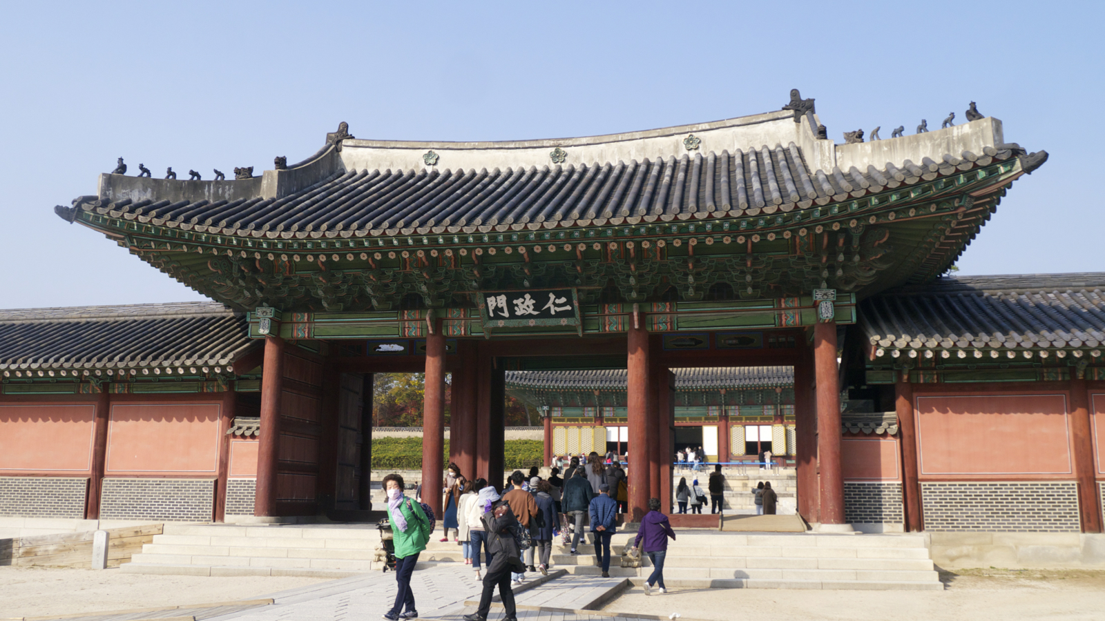 동쪽 방향에 위치한 외조로 진선문을 통해 들어가면, 진행 방향인 동쪽으로는 내전으로 향하는 숙장문(肅章門)이 보입니다. 외조 뒤 내조 구조가 아니라 주변 자연경관에 맞추다 보니 외조에 있는 인정전(仁政殿) 가는 길에 내조 건물들이 보이는 걸 막기 위해 벽도 쌓고 문-숙장문도 배치한 구조가 되어 있다고 하더군요.