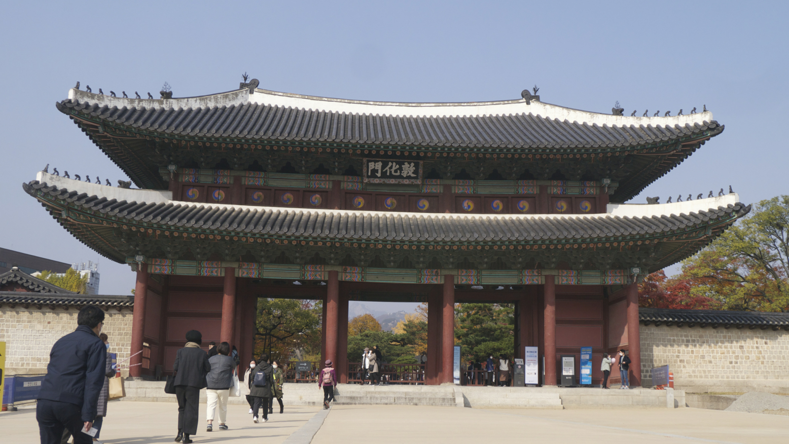 토막상식으로 조선의 모든 정궁들의 정문에는 "화(化)"라는 글자가 들어간다고 하더군요. 그러고 보니, 광화문(경복궁), 돈화문(창덕궁), 홍화문(창경궁), 인화문(덕수궁, 현재는 전소되어 동문인 대안문>대한문이 정문), 흥화문(경희궁) 모두 '화'가 들어가네요. ㅎㅎㅎ 주말이다 보니 많은 사람들이 창덕궁의 단풍을 구경하러 엄청 왔더군요. 외문이자 정문인 돈화문 안에 들어가니 형형색색 옷을 입은 나무들과 사이사이의 전각들이 반겨주더군요.