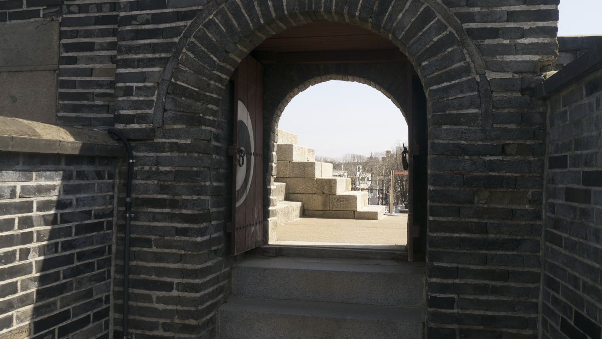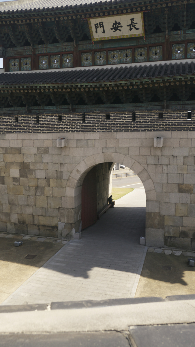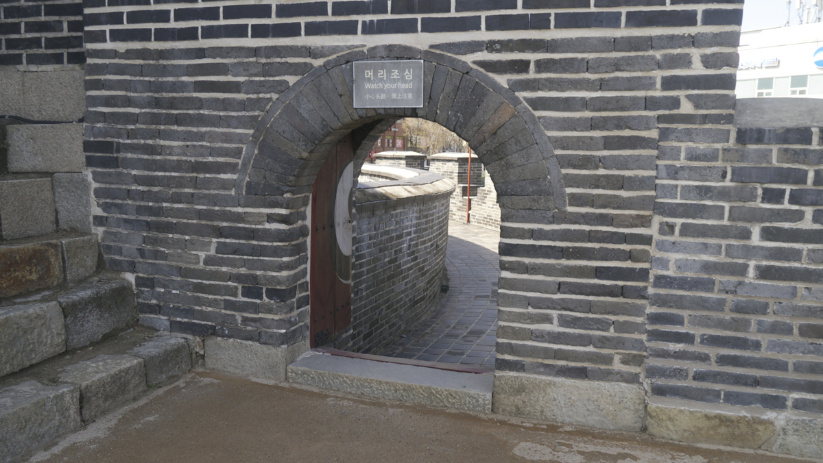 위 사진에서 보듯이 장안문은 창룡문이나 화서문과는 다른 유형의 옹성이 존재합니다. 창룡문이나 화서문의 옹성은 반원 모양의 옹성의 한쪽 끝이 실제로 성곽에 붙지 않아서 그리로 출입이 되는, 즉 성문 자체를 숨기는 구조라고 하면, 장안문은 옹성의 문과 장안문이 일렬로 되어 통행로가 되지만 반원의 옹성이 모두 성곽에 붙어 있기 때문에 옹성 문 안으로 들어왔을 때는 본래의 성곽과 옹성 성곽 위에서 동시에 포위되어 공격당하는 모양새가 됩니다.
