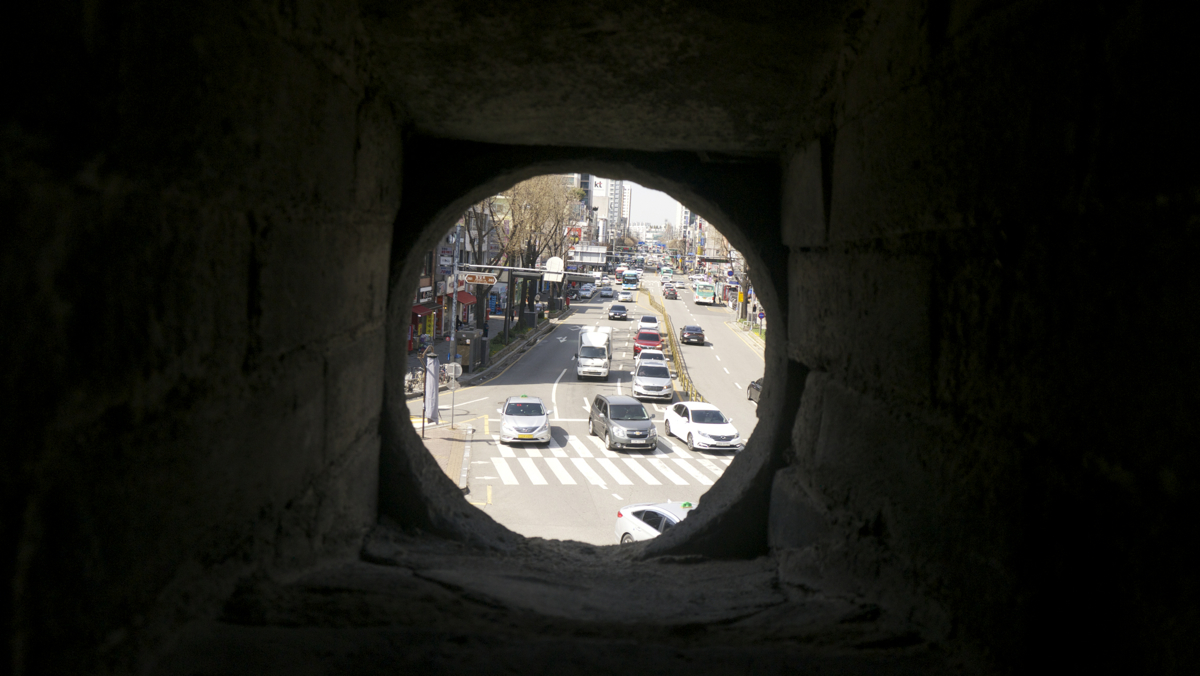 창룡문의 옹성처럼 장안문의 옹성도 통행이 가능합니다. 위의 위 사진에 보이는 조그만 문을 지나 가면 바로 위 사진 처럼 옹성 위를, 즉 반원 위를 걸을 수 있습니다. 옹성의 중간 쯤에 있는 누각에의 조그만 구멍으로 내려다 보면 성 밖은 아래와 같이 보이고, 옹성 성곽에서 내려보는 성 밖은 아래아래 사진과 같습니다. 저 멀리 수원종합운동장까지의 직선로가 훤히 보이는.....