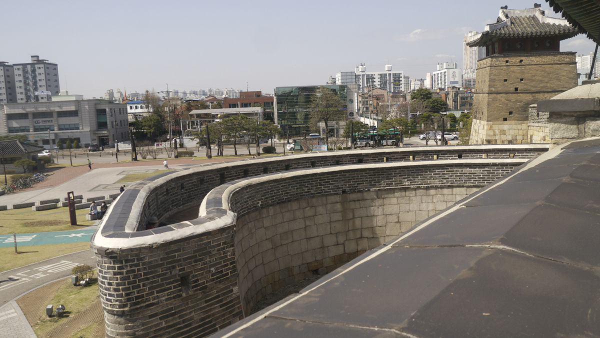 화성의 서문이지만 실제로는 서북쪽에 있는 화서문은 창룡문과 거의 유사한 형태입니다. 1층 누각이 있는 화서문은 앞에 옹성이 나와서 성문을 가리는 구조로 되어 있지만, 아래 사진에서 보듯이 저 옹성의 끝자락에는 통로가 될 수 있는 틈이 존재합니다. 그리고 저 옹성 위는 다른 성문들의 옹성과 같이 걸어다닐 수 있는 구조구요.