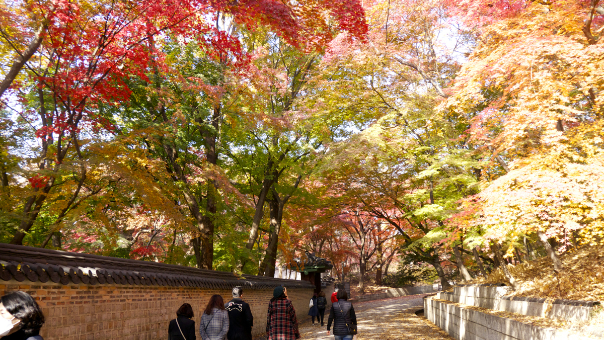 창덕궁 후원 특별관람은 창덕궁과 창경궁을 오가는 함양문 옆으로 난 길로 들어가면서 시작합니다. 특별관람이 아니면, 출입이 통제되어서 아래 사진처럼 바리케이트가 설치되어 있네요. 그 너머로 단풍이 알차게 참 아름답게 펼쳐져 있네요.