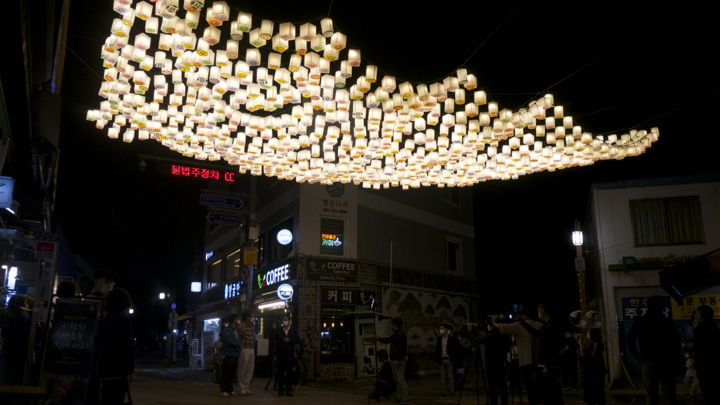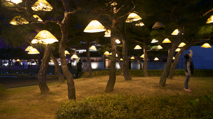 공방거리를 지나서 행궁광장으로 나오니, 행궁광장을 바라봤을 때 오른쪽의 작은 정원에 버섯? 삿갓? 모양의 등이 이쁘게 매달려 있더군요.