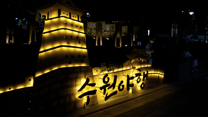 팔달문 로터리에서 이어지는 공방거리 초입에서 조금 올라온 남치가 있는 성벽에 맞닿은 로데오거리와 그 옆 조그만 광장에서 시작되는 수원야행 관련 조형물은 올해도 어김없이 야행을 찾아온 사람들을 기다리고 있었습니다.