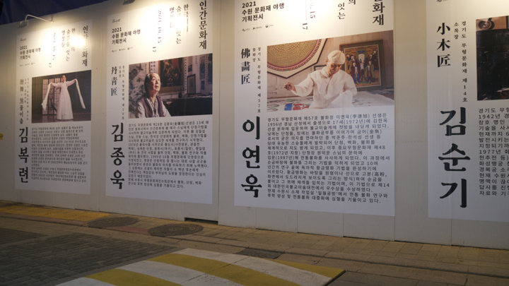 역시나 코로나 때문에 체험형 행사는 많이 안 보이고, 아래 사진처럼 길가에 가벽 등을 설치해서, 수원의 옛 모습이나, 여러 장인 분들의 소개와 작품, 이런 것들이 전시되어 있었습니다. 야행 첫 날 나갔다 보니, 또 이런 행사에 빠지시면 안 되는 여러 기관의 어르신들이 나와서 인터뷰도 하고, 축제에 참여한 시민들에게 인사를 나누는 모습도 볼 수 있었습니다.
