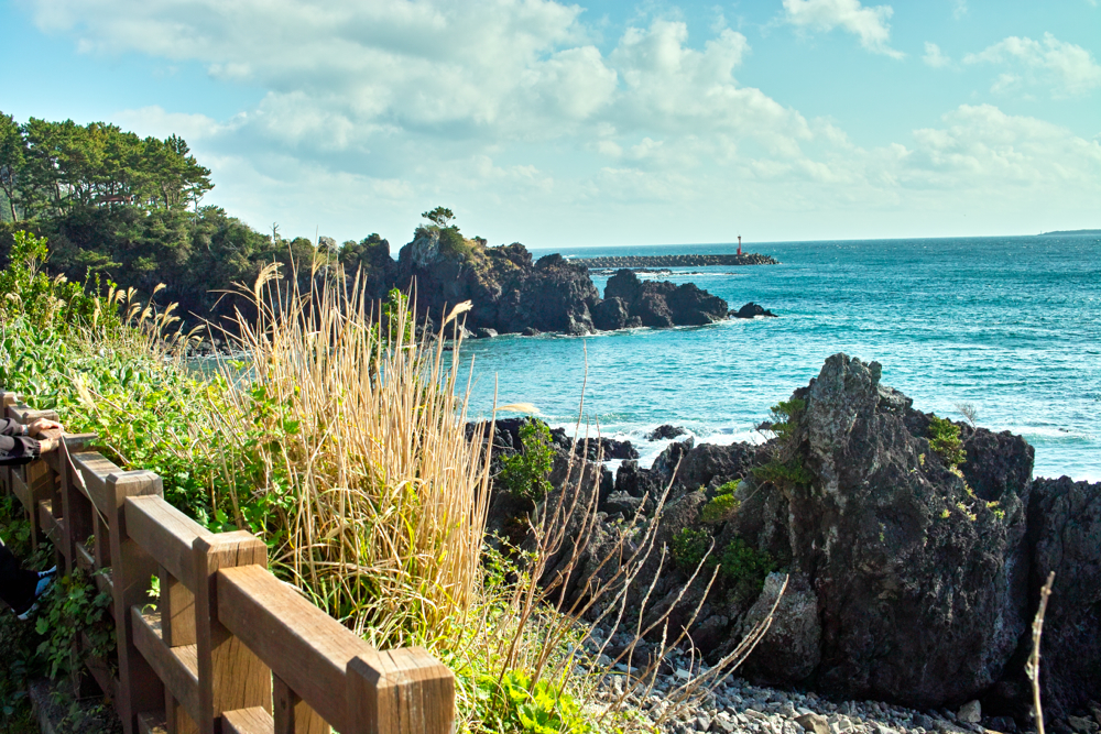 휴애리에서 귤이랑 동백을 원없이 보고는, 잠깐 커피 마실하러 허니문하우스(사진이 없네....)를 들렀다가 바로 앞의 올레 6길을 걸으면서, 바닷바람을 좀 맞았드랬습니다. 또, 이 길에는 아래 중앙에 있는 사진처럼 한반도 모양이 보이는 스팟이 있어서 사진 한 장 또 남겼네요.