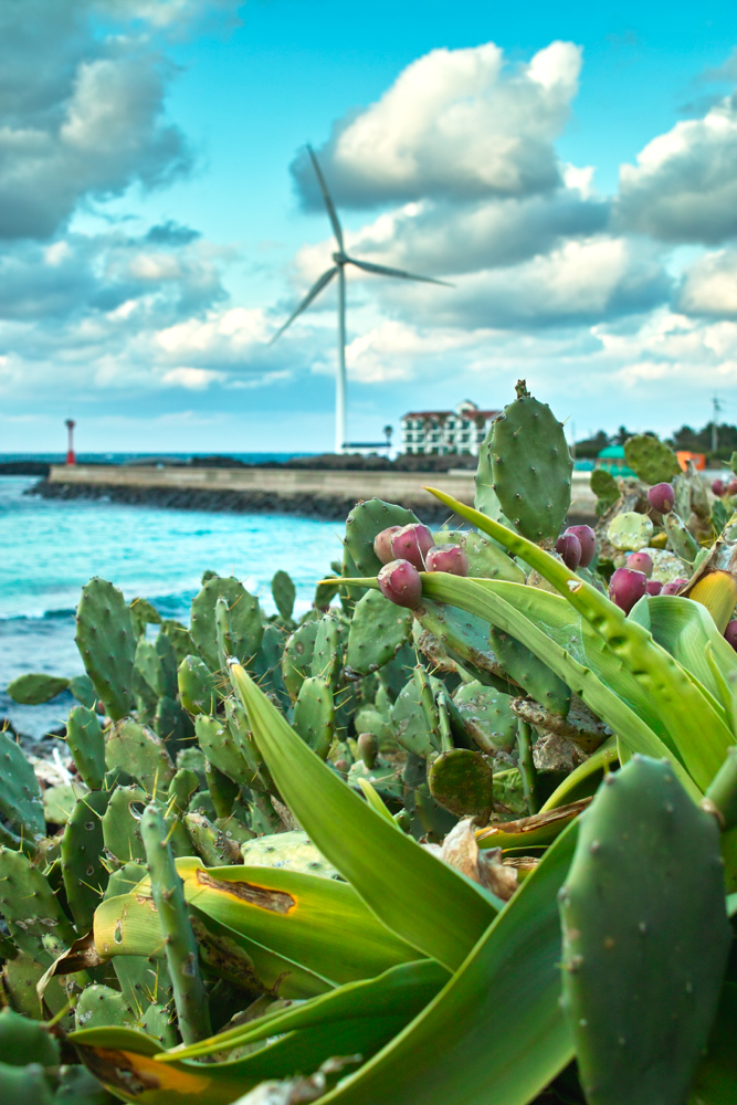 잠깐 차 밖으로 나와 사진을 찍는데, 바람이 너무 세서 바들바들 추위에.... ㅎㅎㅎㅎ 그러고는 일행 중 한 분이 식물을 좋아하셔서, 조금만 더 남쪽으로 가면 있는 월령포구의 선인장군락지로 가 보았습니다. 포구 공터에 차를 세우고는 바닷가 돌들 사이에 피어난 선인장들을 보면서... 이게 어떻게 멕시코에서 해류를 따라 이까지 왔는지... 자연의 위대함이란.... 하지만, 철이 좀 지나서 왔더니 대부분 져가는 선인장꽃인 건 조금 아쉬웠습니다. 그리고, 선인장 군락지를 이쪽 끝에서 저쪽 끝으로 걷는데, 더 남쪽으로 신창해변 앞바다에 세워진 풍차들이 때마침 저무는 저녁노을과 함께 비치는데 나름 장관이더군요.