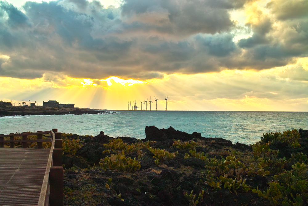 잠깐 차 밖으로 나와 사진을 찍는데, 바람이 너무 세서 바들바들 추위에.... ㅎㅎㅎㅎ 그러고는 일행 중 한 분이 식물을 좋아하셔서, 조금만 더 남쪽으로 가면 있는 월령포구의 선인장군락지로 가 보았습니다. 포구 공터에 차를 세우고는 바닷가 돌들 사이에 피어난 선인장들을 보면서... 이게 어떻게 멕시코에서 해류를 따라 이까지 왔는지... 자연의 위대함이란.... 하지만, 철이 좀 지나서 왔더니 대부분 져가는 선인장꽃인 건 조금 아쉬웠습니다. 그리고, 선인장 군락지를 이쪽 끝에서 저쪽 끝으로 걷는데, 더 남쪽으로 신창해변 앞바다에 세워진 풍차들이 때마침 저무는 저녁노을과 함께 비치는데 나름 장관이더군요.