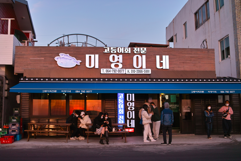 돌고래를 본 기쁨에 잠시 멍 때리고 있다가 바닷 바람이 너무 추워서 바로 차를 타고는 저녁 식사를 하려고 모슬포항으로 향했습니다. 여행을 같이 온 일행이 꼭 가고 싶다고 한 미영이네식당이라는 고등어회로 유명한 집이었는데요. 해가 지기 전에 도착했는데, 이미 꽤 많은 손님이 오갔고, 재료가 떨어져 가는 상황에 거의 마지막에서 5번째 정도 손님으로 입장 순서를 받고는 차례를 기다리며 바로 앞 모슬포항에서 사진을 좀 찍으며 기다렸습니다.