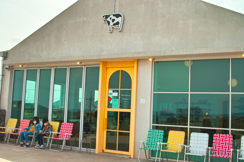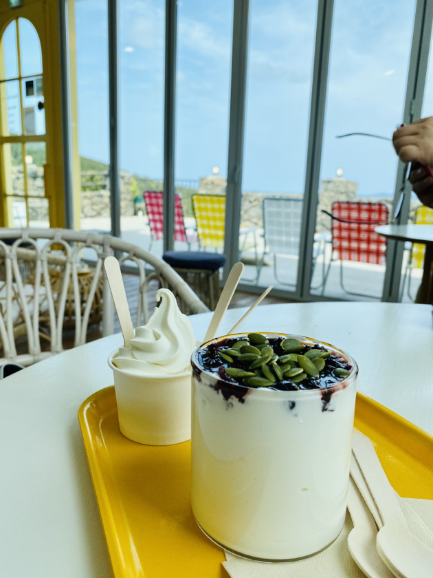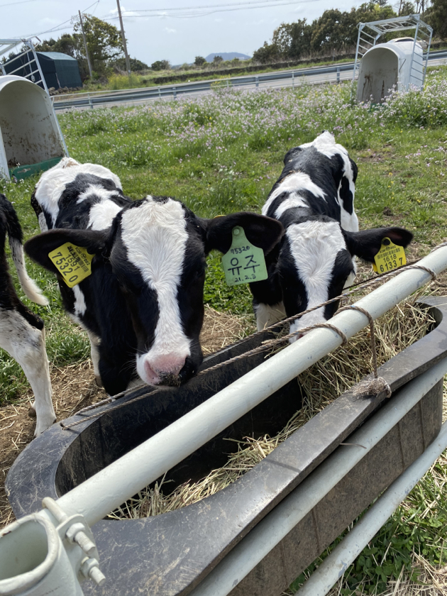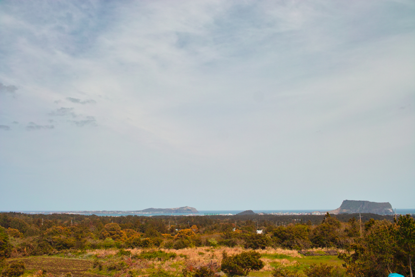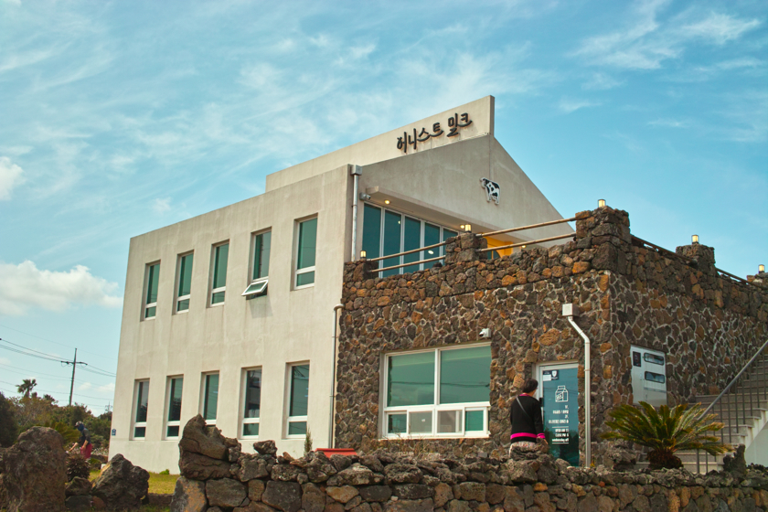 그렇게 시간을 보내고는 어디 갈까 고민하다가 갑자기 바다가 잘 보이는 우유 가게가 생각나서 차를 타고 이동했습니다. 아마 자매 분이 하신다고 했던 걸로 기억하는데, 산간지방에서 성산일출봉으로 가는 길에 있는 어니스트밀크라는 가게 겸 목장이었습니다. 2층에 있는 카페? 가게에 올라가서 동쪽으로 바라보면 성산일출봉과 우도가 보이는데... 나름 Vista Point더군요. 우유는 제가 잘 몰라서 ㅎㅎㅎ