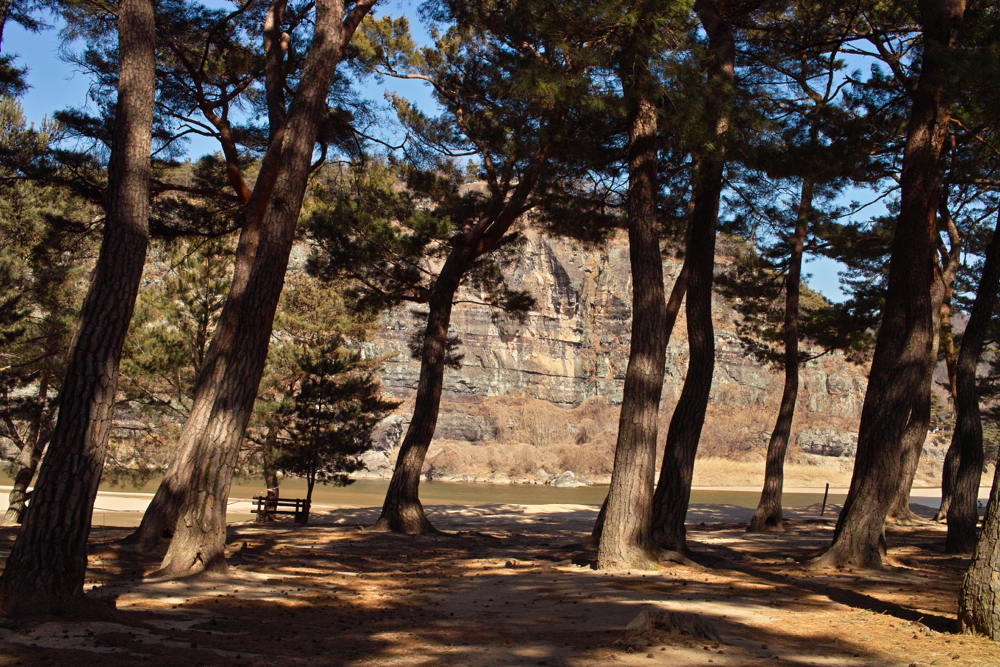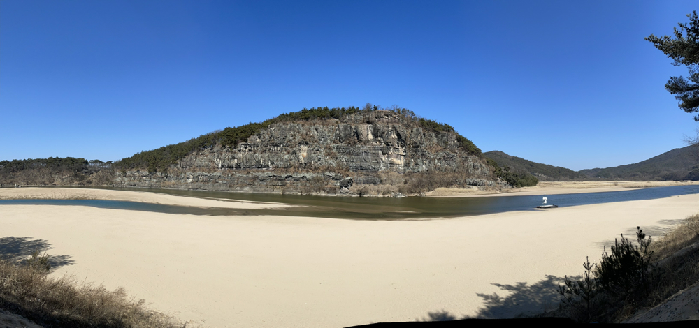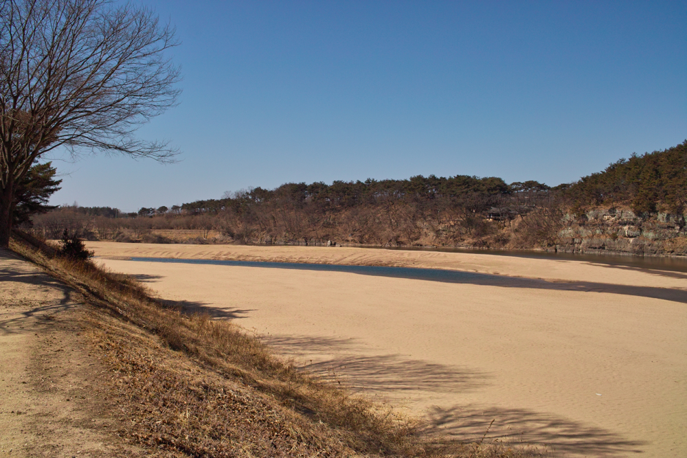 하회마을을 입구부터 쑤욱 훑어 보고는 돌아나올 때는 마을 북쪽 강줄기 따라 있는 만송정 숲 옆길을 따라 나왔습니다. 풍수지리적으로 마을에 부족한 부분을 채우기 위해 일부러 소나무들을 심어서 만들어졌다는 만송정이라고 하는데, 만송정 숲을 지나 가면 마치 해수욕장처럼 고운 흙모래들이 펼쳐져 있으면서, 오전에 가 봤던 부용대가 그 앞에 위용을 펼치고 있는 걸 볼 수 있습니다.