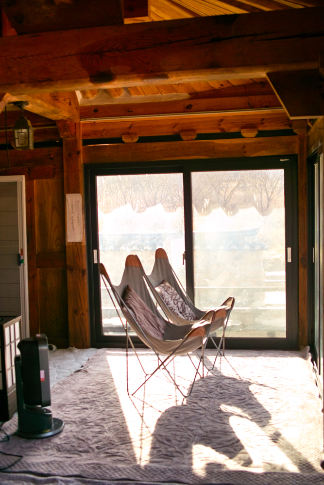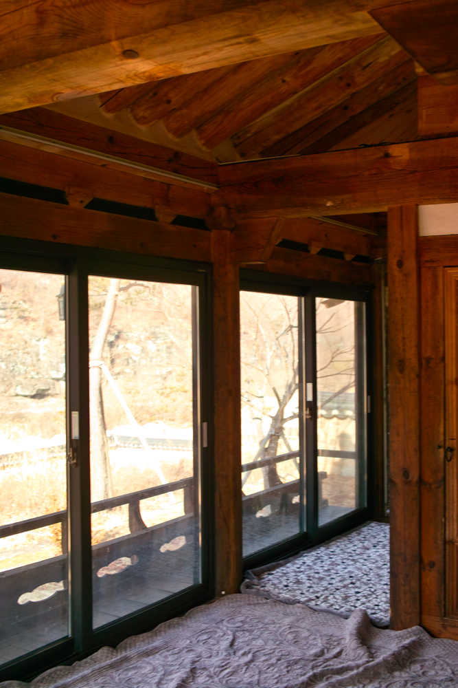 위 사진처럼 명농당만 별도 공간으로 존재했는데요, 진입로를 기준으로 농암종택이 있고, 그 너머에 명농당만 따로 있고, 분강서원이 그 다음에 자리를 잡고, 좀 떨어진 위치에 강각, 애일당이 있습니다. 명농당은 3칸 짜리 건물인데, 위 사진 기준으로 2칸이 각각 방이고, 1칸과 2칸 앞이 마루로 되어 있는데, 거길 유리창과 옆은 다른 방법으로 폐쇄딘 공간을 만들어서, 주인 어르신 말대로 벌레들도 덜 들어오는 공간이 되었더군요. 그리고 유리로 해놓다보니 아래 사진처럼 건물 안에서 바깥을 열손실이나 바람 안 맞고 바라 볼 수 있게 되어 있어 좋았습니다.