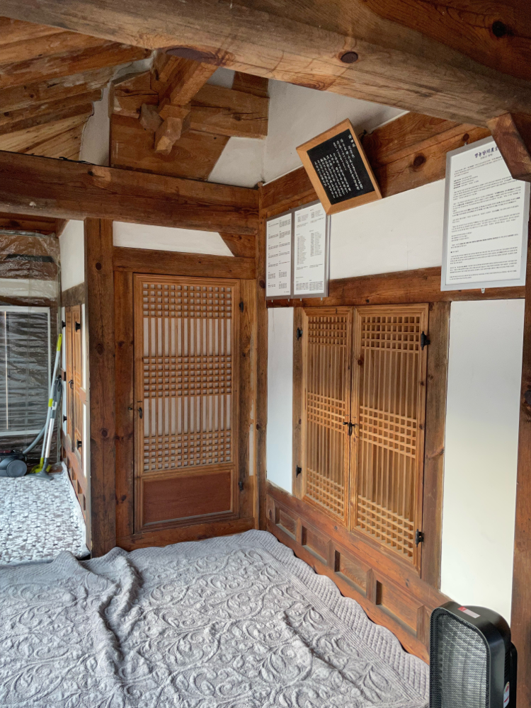 위 사진처럼 명농당만 별도 공간으로 존재했는데요, 진입로를 기준으로 농암종택이 있고, 그 너머에 명농당만 따로 있고, 분강서원이 그 다음에 자리를 잡고, 좀 떨어진 위치에 강각, 애일당이 있습니다. 명농당은 3칸 짜리 건물인데, 위 사진 기준으로 2칸이 각각 방이고, 1칸과 2칸 앞이 마루로 되어 있는데, 거길 유리창과 옆은 다른 방법으로 폐쇄딘 공간을 만들어서, 주인 어르신 말대로 벌레들도 덜 들어오는 공간이 되었더군요. 그리고 유리로 해놓다보니 아래 사진처럼 건물 안에서 바깥을 열손실이나 바람 안 맞고 바라 볼 수 있게 되어 있어 좋았습니다.
