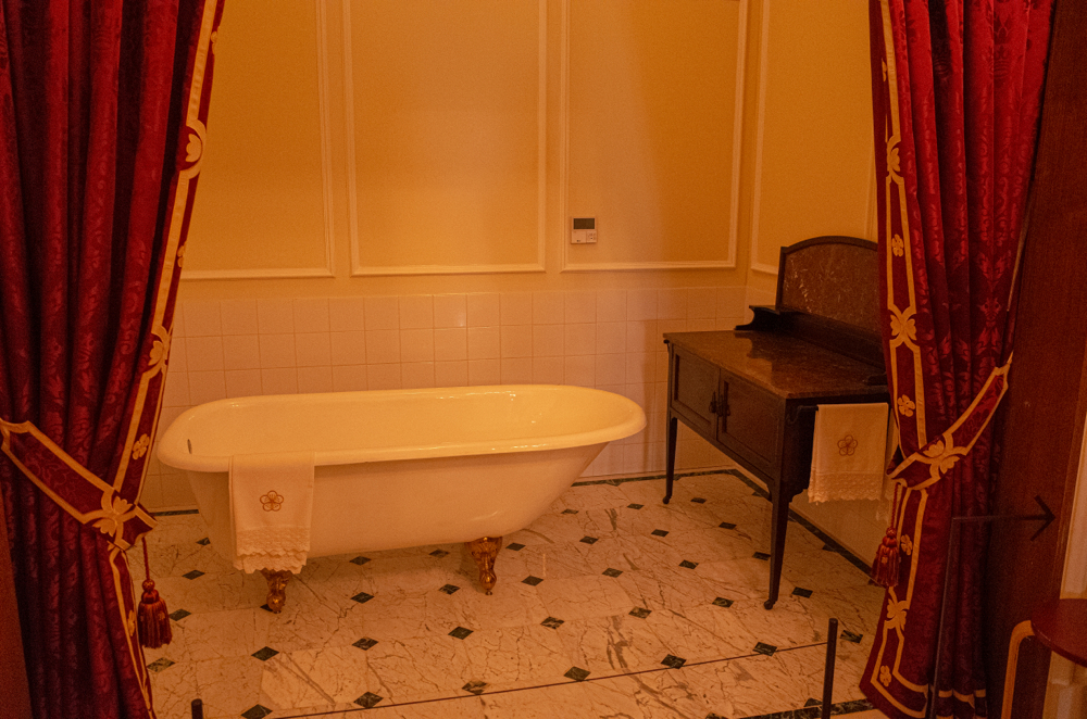 그리고 북쪽(건물 정면에서 보면 뒤쪽)으로 침실과 서재들이 있는데, 그 반대편 남쪽 공간으로는 아래와 같이 세면실/화장실과 욕조가 있는 욕실이 있더군요. (황제 전용과 황후 전용으로 나뉘어 있던 기억이...) 이게 전부 타일이 있었던 기록에서부터 시작해서, 당시 여러가지 자료들을 토대로, 그리고 건축 당시 납품했던 영국 회사의 카탈로그 내 모델 출시/제작연도 등을 비교하는 등의 노력을 통해서 다 재현하게 되었다는 설명에 정말.... 아 나도 이런 걸 하는 직업을 꿈꾼 적이 있었지 라면서.... 정말 여러 고생하신 분들의 노고에 경의를 표하고 싶더군요.