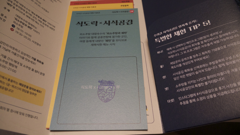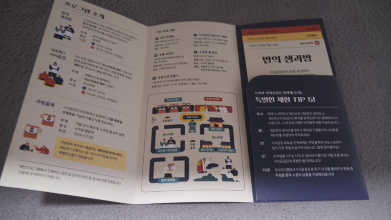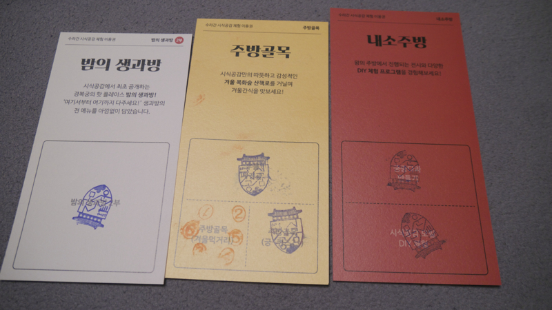 소주방에서 사용하는 도구들이 전시된 공간을 지나면 내소주방 내 안내 부스가 또 있어서, 체험행사 2개에 대한 안내와 참여에 필요한 물품을 또 나눠주고, 대신 입장 시 받았던 팜플렛 내에 내소주방 체험행사 자리에 도장을 찍어서 이용했음을 표시하더군요. 저도 2개 다 해 봤는데, 뭘 만드는 재주는 없어서.....