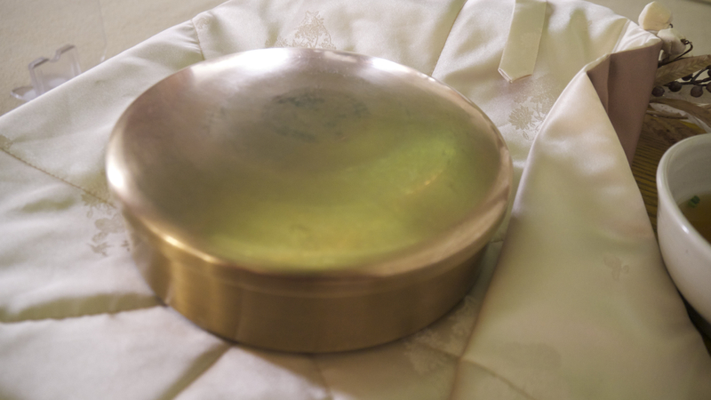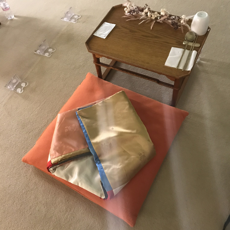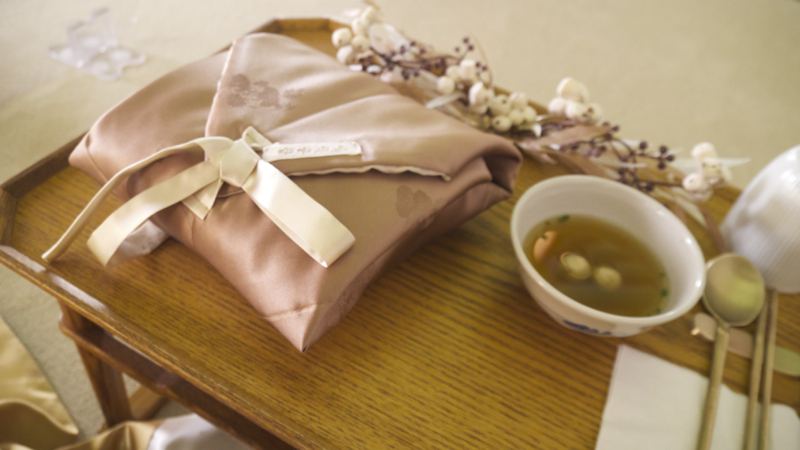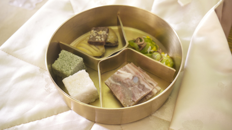 외소주방에서 진행된 "식도락"의 경우에는 다식이 아닌 식사가 제공이 되었습니다. "궤반"이라고 하여, 군인들에게 하사되었던 도시락을 행사 참여자에게 나눠줬습니다. 외소주방 건물에 참여자별로 반상과 방석이 차려져 있었구요. 자리에 앉으니까, 아래와 같이 놋그릇찬합에 담긴 식사와 탕국을 나눠줬습니다. 이걸로 저녁 식사를 하면서 보내는 게 "식도락" 행사였습니다.