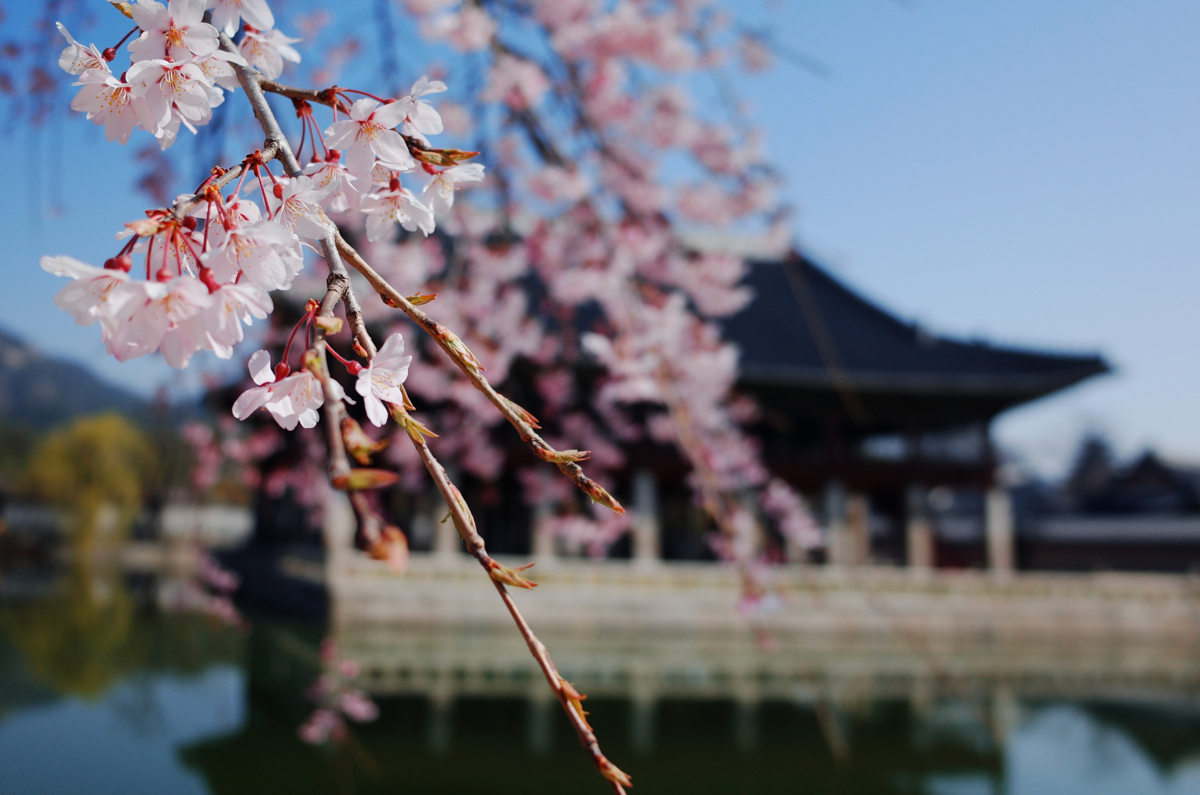 경복궁에 그냥 방문하든, 야간개장이든, 아님 특별행사를 하던 경회루를 안 들리고 나오는 경우가 거의 없을 정도로 많은 이들이 방문하는데, 평일 아침 오픈 런으로 가니 사람들이 얼마 없어서, 이렇게 사람 없는 경회루를, 그것도 꽃 핀 배경으로 사진을 찍을 수 있었네요.