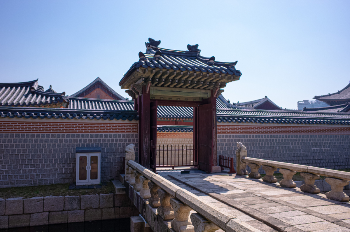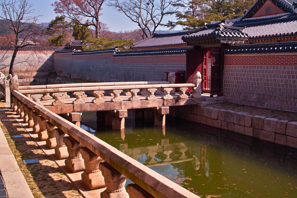 경회루 동쪽에는 경회루로 입장하는 다리가 3개가 있는데, 위 사진에는 그 중 가장 북쪽에 있는 문과 석교, 가장 남쪽에 있는 문과 석교가 보이는데요, 혹시 이 중에 어느 문이 왕이 출입하는 문인지 아시겠는지요? 정답은 오른쪽 사진의 남쪽에 있는 문과 석교입니다. 문이 왼쪽과 달리 한 층 더 있는 구조로 되어 있습니다. 신하들이나 다른 이들이 입장하는 문은 그냥 단순한 1층 지붕 구조인데, 왕이 출입하는 문은 지붕 위 지붕처럼 하나 더 올라간 모양이랍니다.