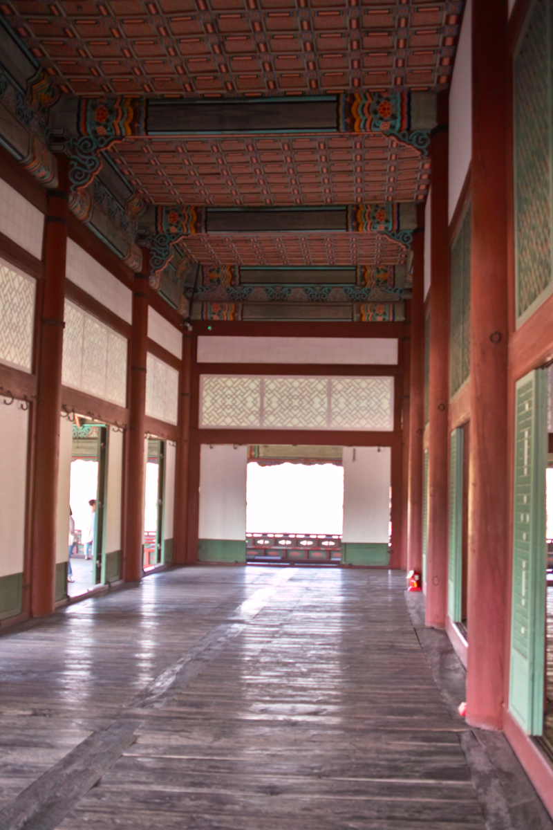 계단을 타고 올라와 보니 경회루 2층은 정말 화려하게 꾸며진 공간이더군요. 위 오른쪽 사진처럼, 경회루 2층은 내부 기둥과 문들을 통해서, 3개의 구역으로 구분이 되는데, 마치 중심을 공유하는 3개의 크기가 다른 사각형이 포개진 구조로 보시면 될 거 같습니다. 그리고, 안쪽 구역이 바깥 구역보다 바닥의 높이가 조금씩 높아서, 가장 안쪽이 가장 높은 바닥으로 되어 있더군요. 다들 짐작하시겠지만, 가장 안쪽이 왕과 가장 귀한 손님들이 자리하게 되고, 그 다음 안쪽 방에는 그 다음 서열이, 그리고 나머지는 가장 바깥 구역에 앉아서 연회를 했다고 하네요. 아래 두 사진에서 왼쪽 사진을 보면 왼쪽에서 오른쪽으로 바깥에서 안으로 구역이 바뀌는 걸 볼 수 있고, 오른쪽 사진에서는 가장 안쪽 구역이 보입니다.