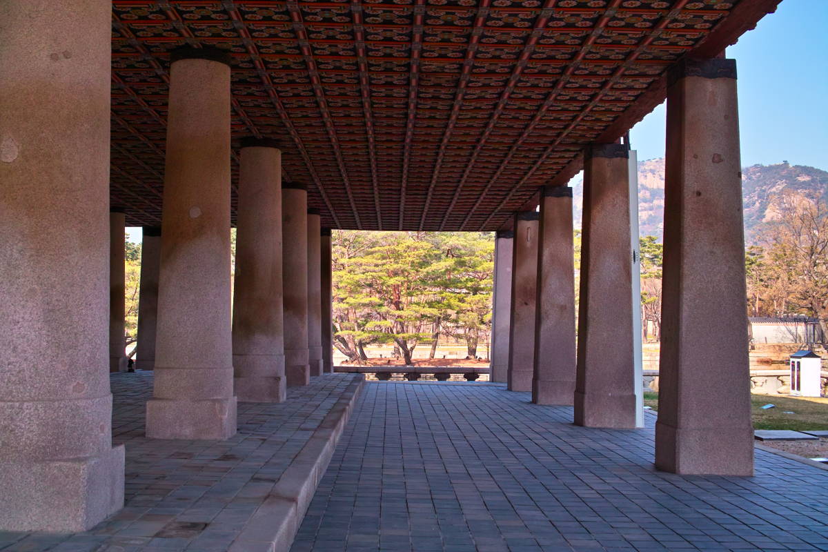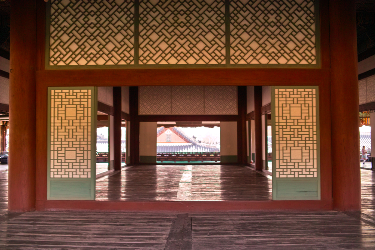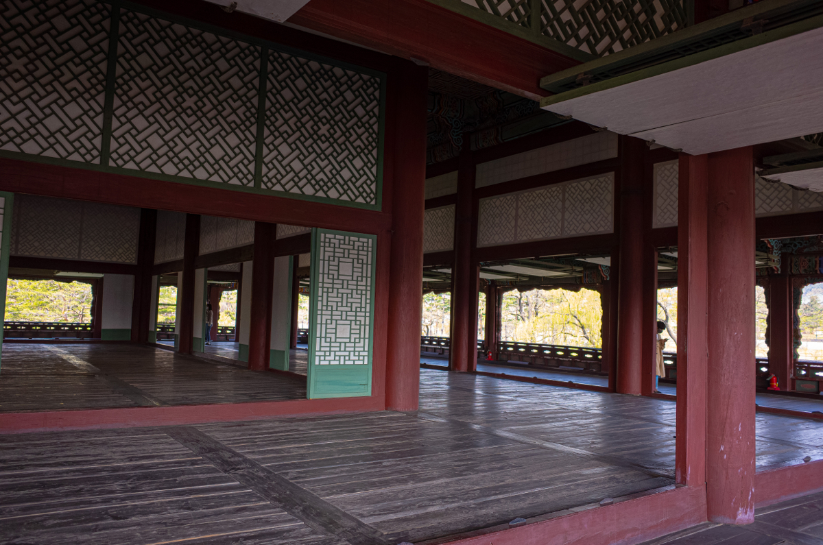 계단을 타고 올라와 보니 경회루 2층은 정말 화려하게 꾸며진 공간이더군요. 위 오른쪽 사진처럼, 경회루 2층은 내부 기둥과 문들을 통해서, 3개의 구역으로 구분이 되는데, 마치 중심을 공유하는 3개의 크기가 다른 사각형이 포개진 구조로 보시면 될 거 같습니다. 그리고, 안쪽 구역이 바깥 구역보다 바닥의 높이가 조금씩 높아서, 가장 안쪽이 가장 높은 바닥으로 되어 있더군요. 다들 짐작하시겠지만, 가장 안쪽이 왕과 가장 귀한 손님들이 자리하게 되고, 그 다음 안쪽 방에는 그 다음 서열이, 그리고 나머지는 가장 바깥 구역에 앉아서 연회를 했다고 하네요. 아래 두 사진에서 왼쪽 사진을 보면 왼쪽에서 오른쪽으로 바깥에서 안으로 구역이 바뀌는 걸 볼 수 있고, 오른쪽 사진에서는 가장 안쪽 구역이 보입니다.