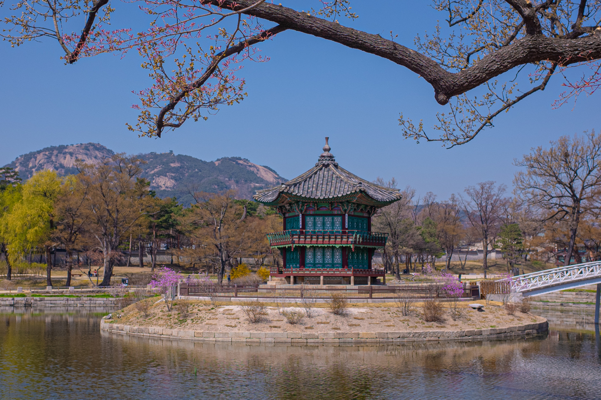 한동안 공사로 그 모습을 볼 수 없었던 향원정(香遠亭)이 드디어 그 모습을 드러냈습니다. 고종 즉위 후 흥선대원군이 경복궁을 중건하면서 후원 영역에 인공호수인 향원지(香遠池) 가운데 서 있는 향원정인데요. 이전에 복원된 건물이 다리의 방향이 원래랑 다르고, 많은 관람객으로 내부 안전의 문제가 있어서 이번에 다리 위치도 약간 북쪽으로 옮기고, 건물도 보강해서 세워졌습니다. 화창한 봄날 점심에 북한산을 배경으로 한 향원정은 참 아름답더군요. 저 안에 들어가는 특별관람은 언제하나 궁금해 하며, 봄날 아침 경복궁 나들이의 마무리를 하려 남으로 또 발걸음을 옮겼네요.