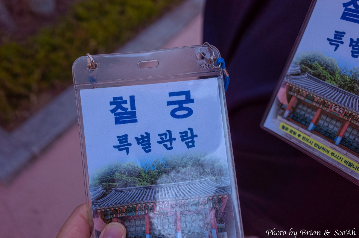 무궁화동산에 가면 조그만 "칠궁안내소"라고 이름이 붙어 있는, 안내부스가 있는데 여기에 가면 시간제로 현장에서(제가 방문했을 땐 그랬습니다.) 매 시각 정시마다 입장하는 걸 예약해야 합니다. 별도의 입장료는 없으나, 위치가 위치이다 보니 신분증을 확인하고 연락처를 기록해야 하더군요. (지금은 거주자가 없지만, 한 때는 대한민국의 정상이 살던 집 옆이었으니 보안 문제로....) 그러고 나면 입장객을 구분하기 위한 안내 목걸이를 주더군요.