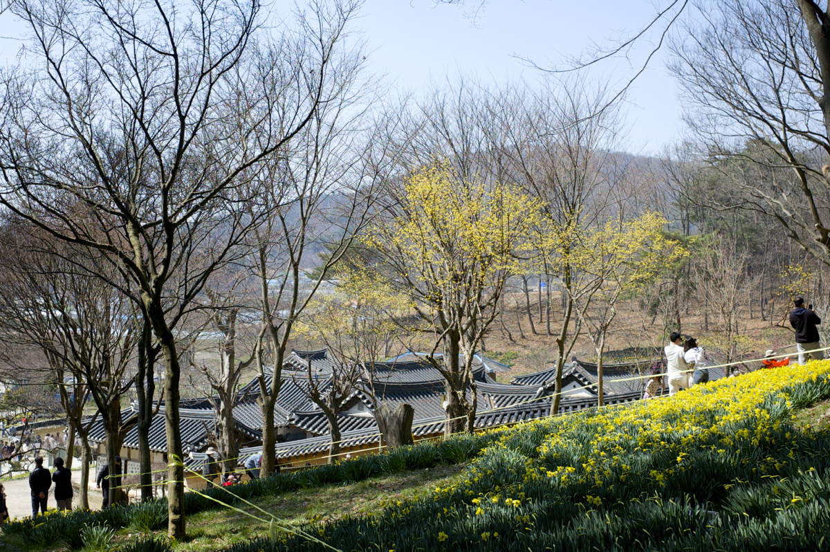일단 가옥 구경은 나중에 하고, 조금이라도 체력이 있을 때 수선화가 가득한 야산을 걸어 올라갔는데, 여기저기 노오란 수선화가 가득하고, 그 사이사이 중간에 들어가서 사진을 찍을 수 있는 포토 스팟에는 어김없이 줄 서서 기다리는 관광객들. 그리고 야산에서는 유기방 가옥이 모두 내려다 보여서, 거기도 포토 스팟이라 사람들이 줄 서서 기다리고 있더군요. 왔으니 일단 인증샷이라도 남겨야지 하고, 저희 일행도 여기저기 한 3~40분 돌면서 사진을 찍었던 기억이 나네요.