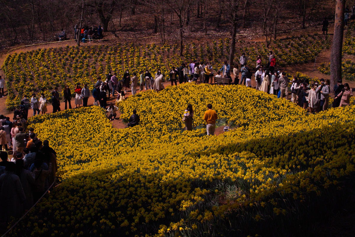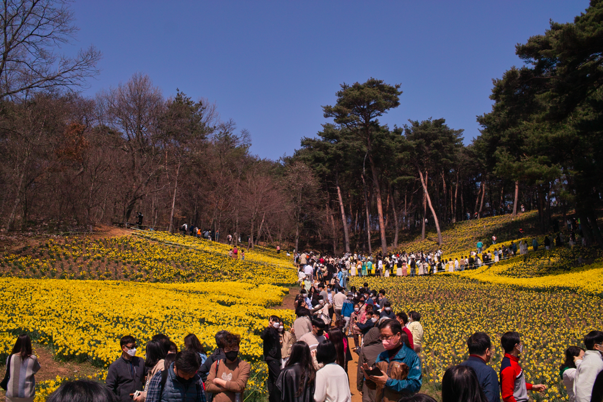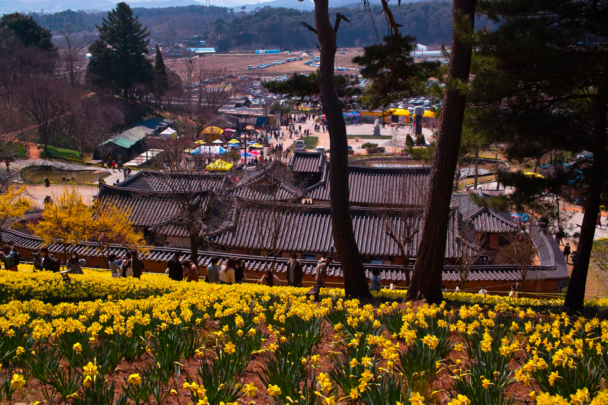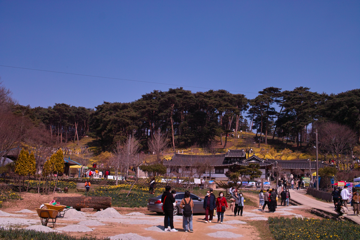 다행히 가장 유기방가옥에 가장 가까운 주차장에 차를 대고, 매표소에서 입장료를 내고 입장하니.. 실내 공간이 아니라, 말 그대로 동네 어느메의 오래된 가옥과 그 뒤 야산(정말 낮은 언덕은 아니고 산)에 가득 핀 수선화를 보러 오는 거라서, 주차장에서부터 '아 저기 노란 곳이 축제 현장이구나'하고 인지할 수 있을 정도의 꽃이 만발해 있더군요.